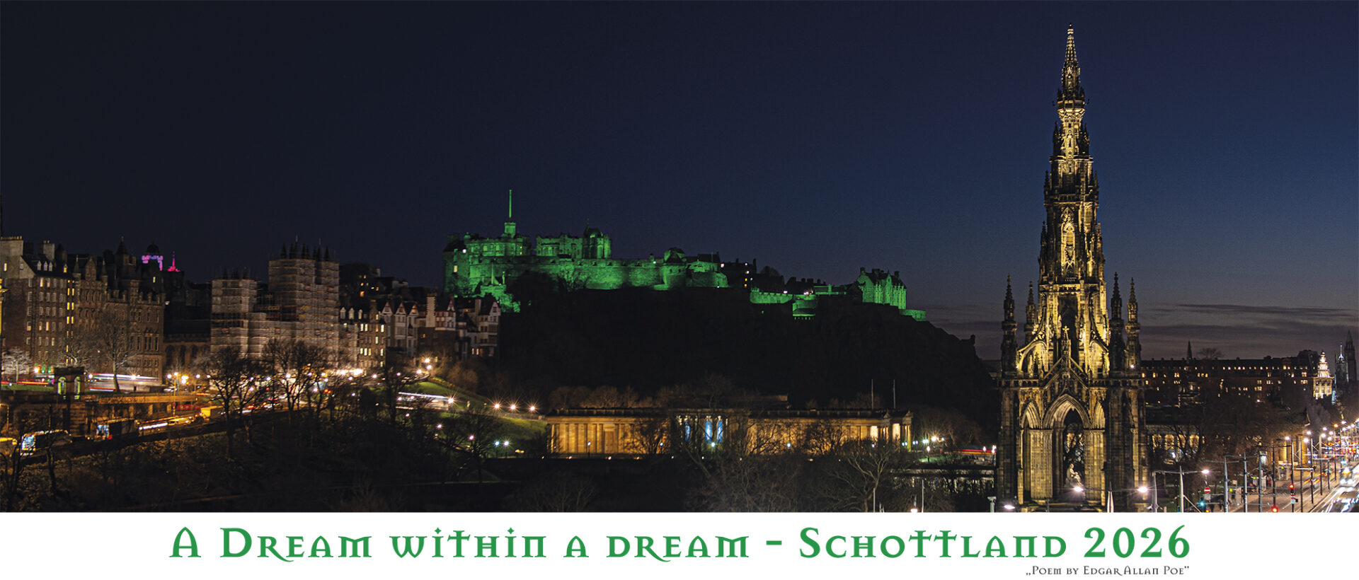 Der 23. Schottland-Panoramakalender der Fesls trägt den schönen Titel „A dream within a dream“ – angelehnt an ein Gedicht von Edgar Allan Poe, in dem es um die Flüchtigkeit der Dinge geht. Und auch das nächste Jahr wird an uns vorbeiziehen – diesmal aber mit besonders beeindruckenden Bildern aus Schottland!