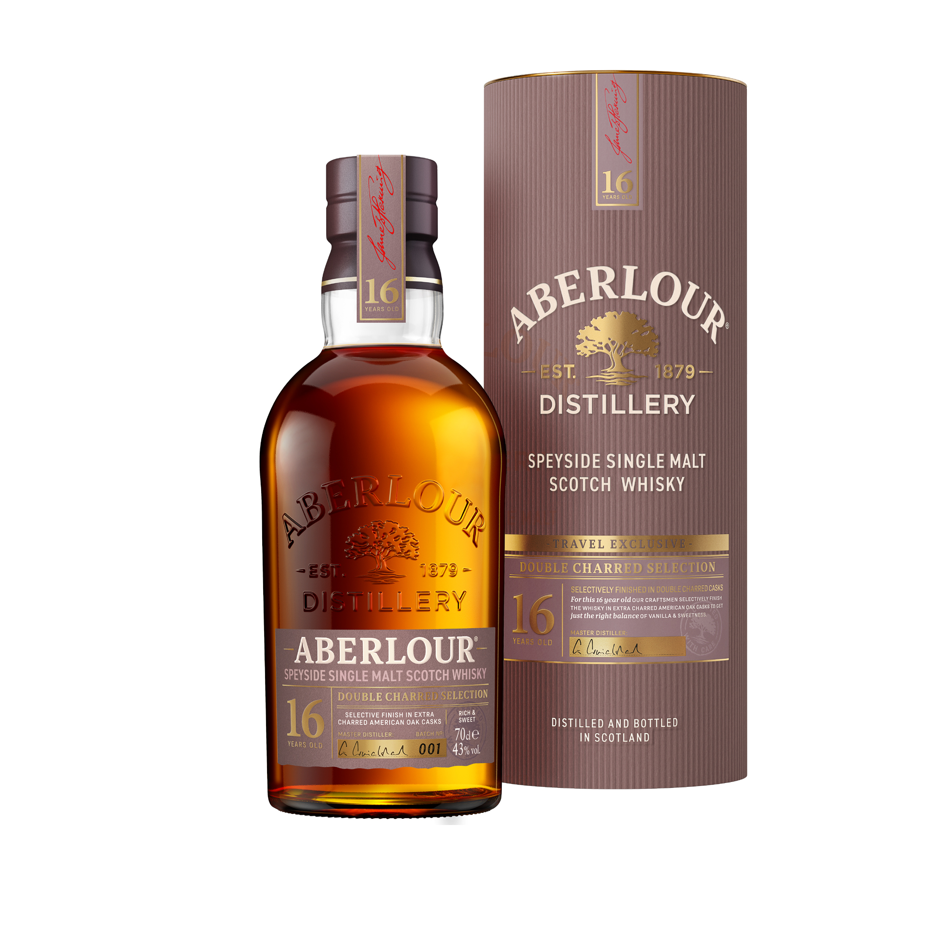 The release of this travel exclusive range features the new look and feel in keeping with Aberlour’s recent significant visual identity refresh. The new packaging reflects Aberlour’s profound connectivity to the beautiful natural landscape surrounding the distillery. The colour palette is warm and earthy, and the new label features a dominant oak tree over water. The water signifies the fluidity of the River Lour, which neighbours the Aberlour distillery. True to Aberlour’s ethos of progressive craft, the evolved design has been developed with resource-efficiency in mind, including a recyclable presentation canister2 and a 16% reduction in the glass bottle weight from the previous bottle design. Whilst the presentation of the whisky has been refreshed, the expertly crafted single malt within remains as impressive as ever, with rich, complex, and balanced flavour profiles.