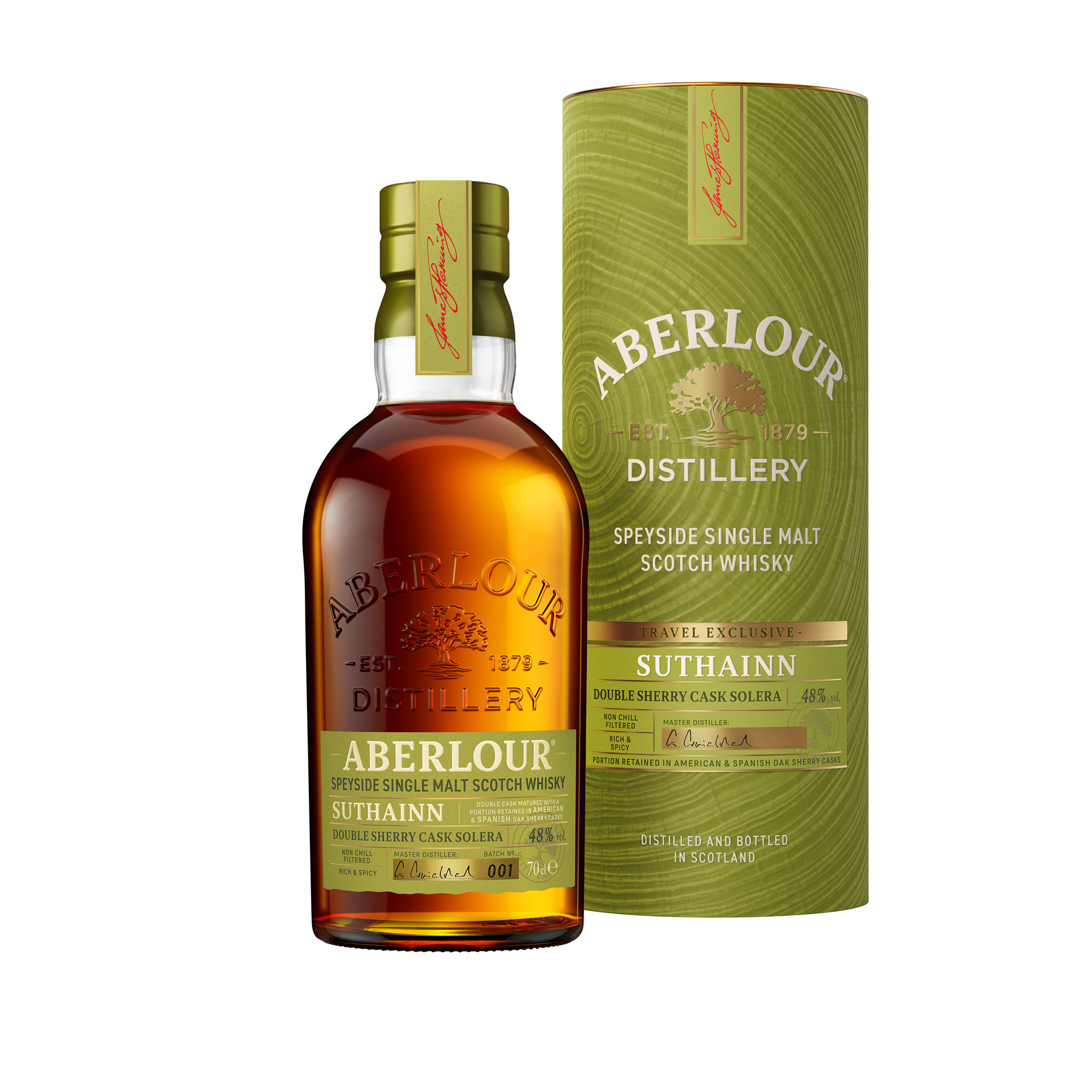 Aberlour Suthainn erscheint ohne Altersangabe, mit 48 % Vol. und ohne Kühlfiltrierung. Der Whisky wurde mit einer einzigartigen Version des Solera-Verfahrens, einer zusätzlichen Reifung in European sherry hogshead casks, hergestellt und wird in verschiedenen Batches erscheinen. Die UVP liegt hier bei £85.