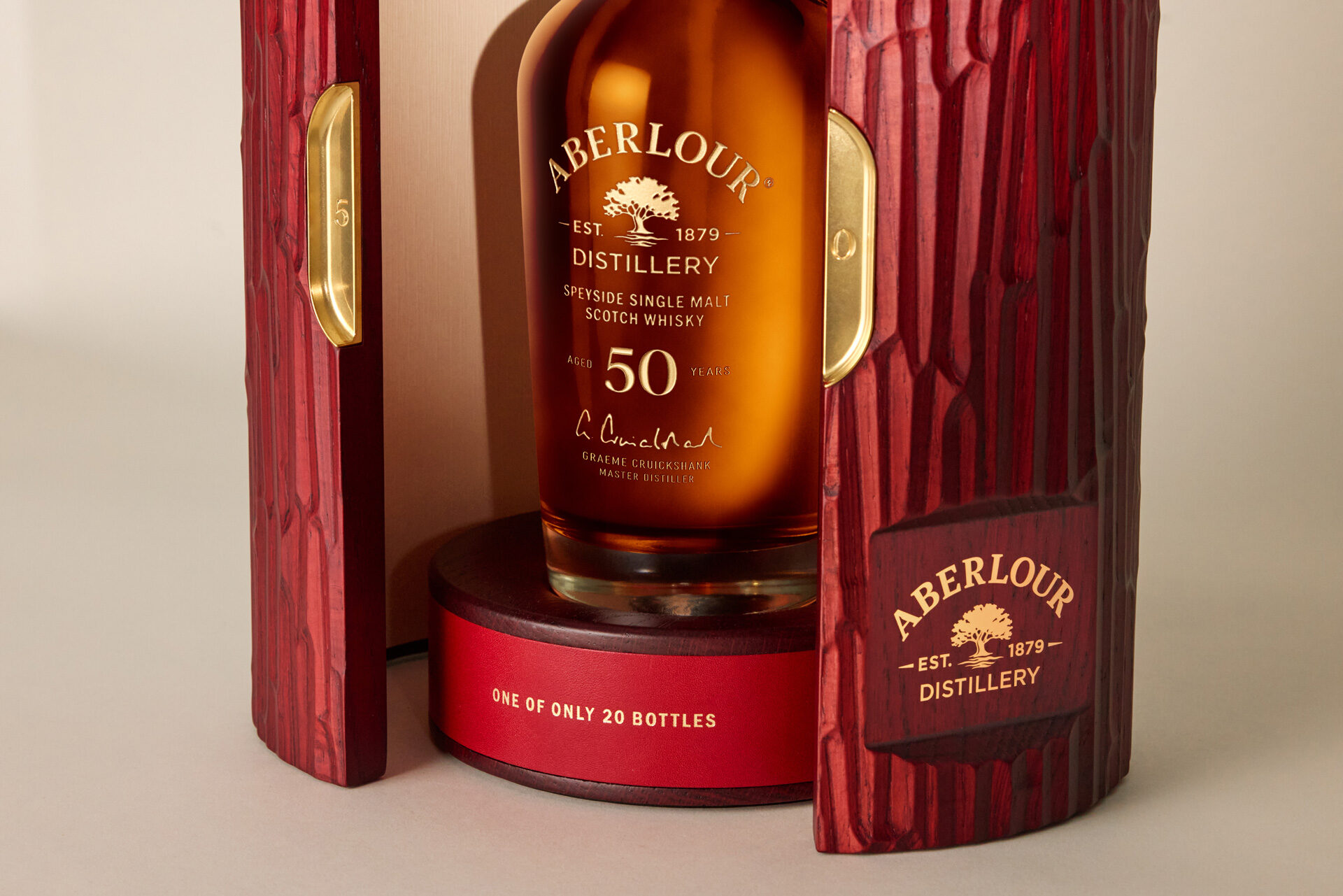 Jede Karaffe des Aberlour 50 Year Old befindet sich in einem maßgefertigten Eichenschrank, der vom Designer John Galvin, bekannt für seine preisgekrönten zeitgenössischen Arbeiten, handgefertigt wurde. Jedes einzelne Stück wurde aus zwölf Eichenholzdauben gefertigt. Die Außenseite ist so geschnitzt, dass sie die Maserung und Struktur der natürlichen Rinde widerspiegelt. Jeder Eichenschrank enthält einen Sockel aus gefrästem Granit, der direkt aus dem Stein des historischen, stillgelegten Lagerhauses der Destillerie stammt.