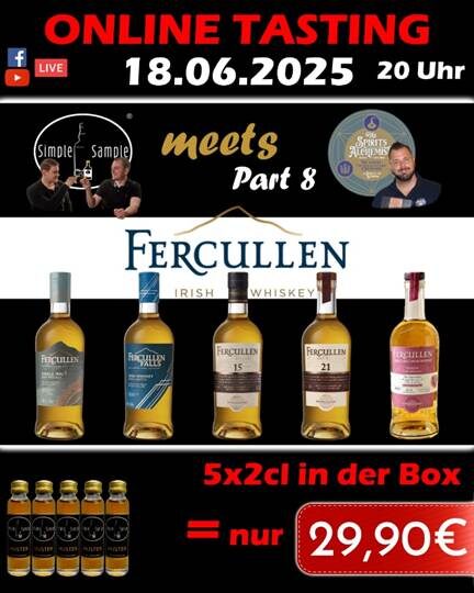 Schon eine Woche nach dem Live Tasting von Simple Sample am 11. Juni, das sich mit Spey beschäftiget, steht Sebastian Büssing aka The Spirits Alchemist erneut auf der virtuellen Bühne und verkostet gemeinsam mit Simple Sample fünf Abfüllungen der Powerscourt Distillery aus Irland, die unter dem Markennamen Fercullen firmieren.