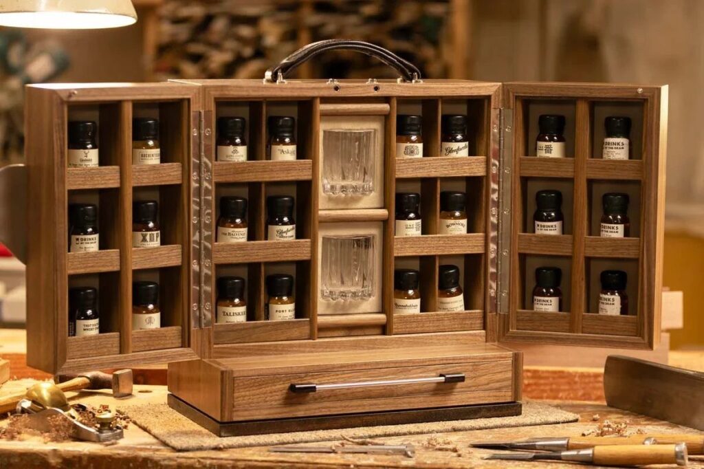 Das Ganze wird in einer an einen Apothekerschrank erinnernden Schatulle aus Echtholz präsentiert, die mit Leder ausgeschlagen ist. Die Türen aus Walnussholz sind mit einem Baumringmuster aus schwarzer Eiche eingelegt, das mit einer gravierten Edelstahlplatte und Druckknöpfen zum Öffnen versehen ist. Unten ist eine Lade, in der die Tasting Notes zu den Whiskys verstaut sind. In der Mitte finden sich zwei Tumbler von Riedel-Glas – aber unser Vorschlag wäre, die edlen Tropfen dann doch eher in Nosing-Gläsern zu verkosten.