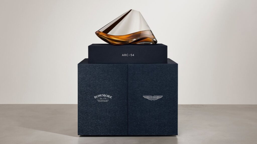 Jeder handgeblasene Dekanter ist inspiriert von der Formel 1-inspirierten aerodynamischen Außenform des Aston Martin Valkyrie Hypercars, einschließlich der vollflächigen Venturi-Tunnel, die zu einem Abtrieb von rund 1.100 kg beitragen, sowie den natürlichen fließenden Formen des Terroirs von Islay. Ausgehend von der Designrichtung und den Prinzipien von Aston Martin, wird Bowmore ARC-54 mit Präzision geformt und erzeugt ein beeindruckendes Gefühl vom Fluss in den Linien und der Gestaltung. Die Form wird durch diese flüssigen Aerodynamiken definiert und zeigt die gemeinsame Philosophie durch die diffuser-inspirierte Glasskulptur, die die fließenden Reflexionen des Whiskys im Inneren verstärkt.