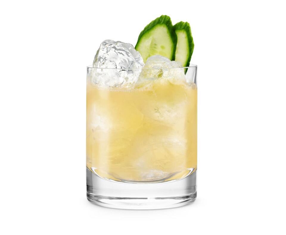 • Den Cocktail durch ein Sien in einem mit Eis gefüllten Tumber einschenken