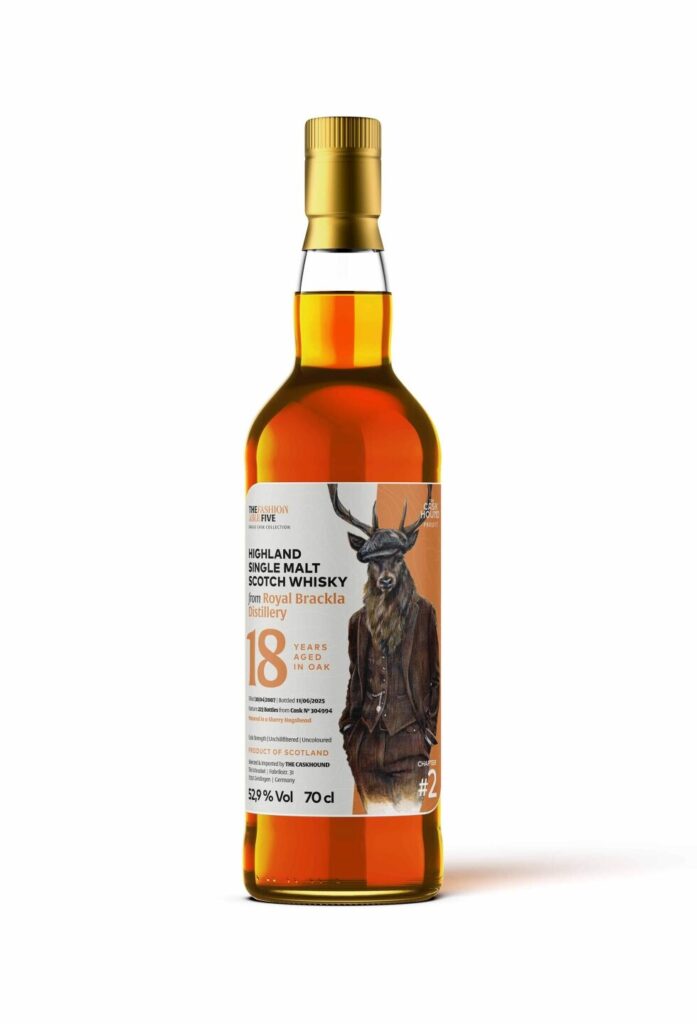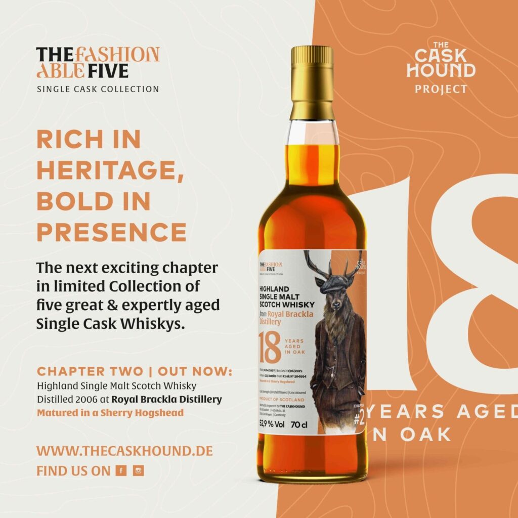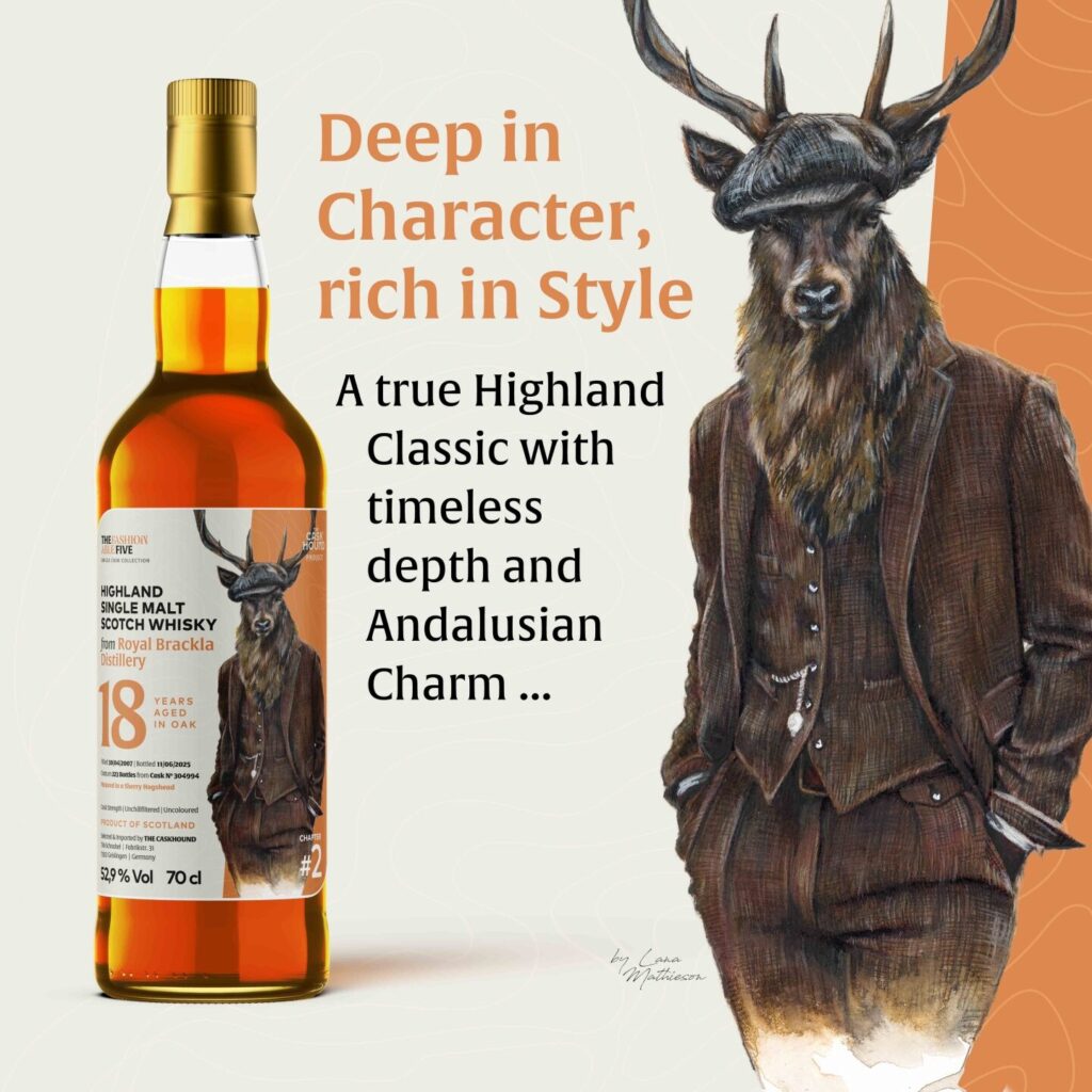 Mit der zweiten, spannenden Abfüllung führt Tilo Schnabel, alias THE CASKHOUND, seine limitierte Abfüllungsserie THE FASHIONABLE FIVE fort. Diesmal im Rampenlicht: ein 18 Jahre im Sherry Hogshead gereifter Single Malt aus der renommierten Destillerie ROYAL BRACKLA – ein wahrer Highland-Klassiker mit zeitloser Tiefe und viel andalusischem Charme. Die Label-Illustration der schottischen Künstlerin Lana Mathieson verkörpert den Charakter des Whiskys dabei ebenso edel wie selbstbewusst – stylish, markant und very very scottish.