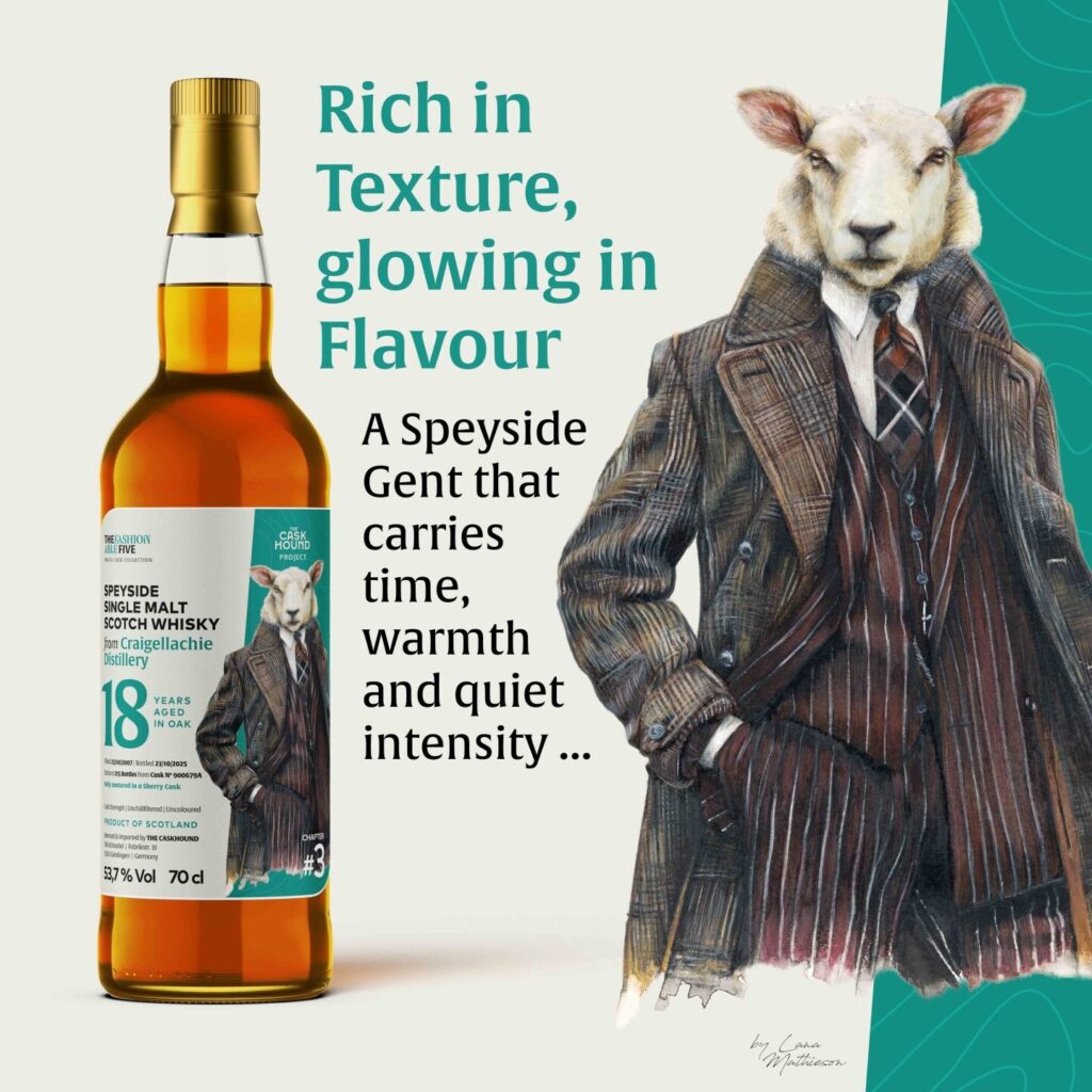 Mit der dritten, ebenso spannenden wie charaktervollen Abfüllung führt Independent Bottler Tilo Schnabel, alias THE CASKHOUND, seine limitierte Serie THE FASHIONABLE FIVE fort. Diesmal im Fokus: ein rund 18 Jahre durchgehend im Sherryfass gereifter CRAIGELLACHIE Single Malt – ein „Speyside Gent“ mit Haltung, reich an Textur, leuchtenden Aromen und dieser typisch ruhigen Intensität, für die die Destillerie seit Generationen steht.