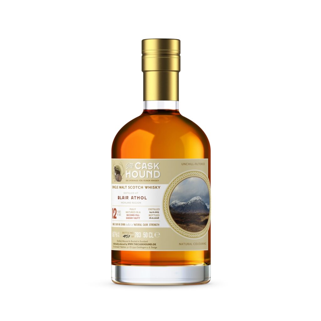 NOSE: In der Nase zeigen sich zunächst Gewürze — Zimt, Muskat, ein Hauch Ingwer — und darunter der typische Blair-Athol-Charakter: geröstete Haselnüsse, Marzipan, eine leichte Fleischigkeit. Mit etwas Luft kommen kandierte Orangenschale, dunkle Beeren, Tabak und ein Hauch Mokka dazu. Der Sherry hält sich dezent im Hintergrund.