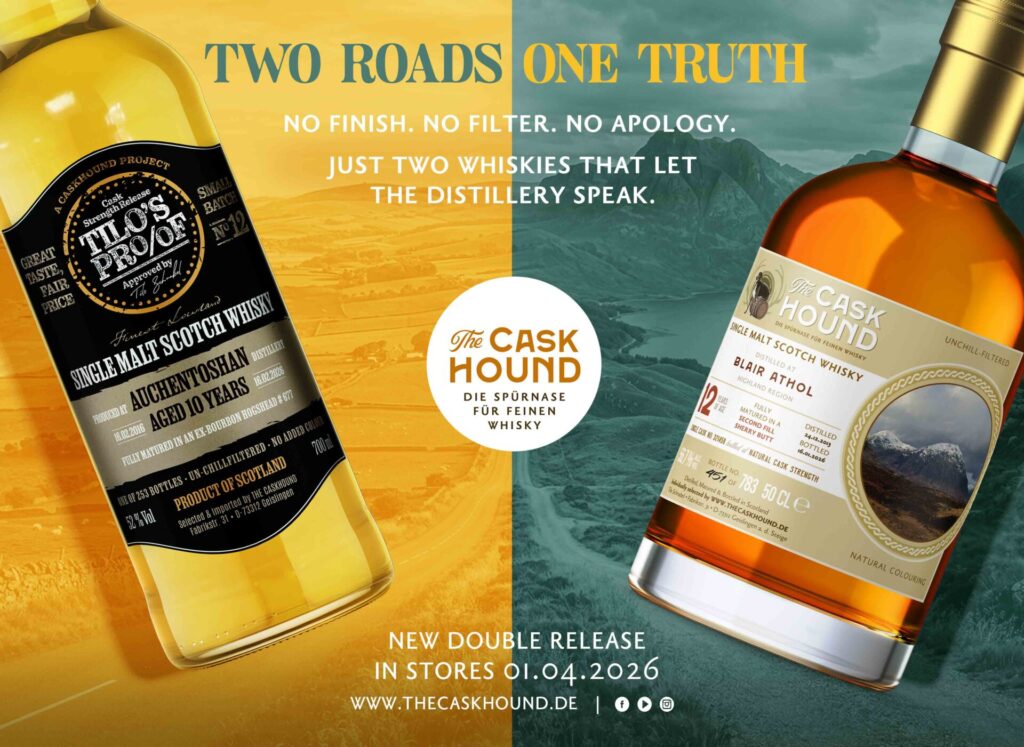 Lowlands gegen Highlands. Bourbon Hogshead gegen Sherry Butt. Leichtigkeit gegen Tiefe. THE CASKHOUND-Mastermind Tilo Schnabel liebt Gegensätze – und sein neues DOUBLE RELEASE liefert zwei ausdrucksstarke & gefährlich trinkbare Argumente, warum! Es schickt einen 10 Jahre gereiften AUCHENTOSHAN und einen 12-jährigen BLAIR ATHOL gemeinsam auf die Reise – zwei Single Malts, die auf den ersten Blick keine gemeinsame Sprache sprechen, auf den zweiten Blick aber dieselbe Wahrheit erzählen: Kein Finish, keine Retuschen, kein Fass, das dem Destillat das letzte Wort nimmt.