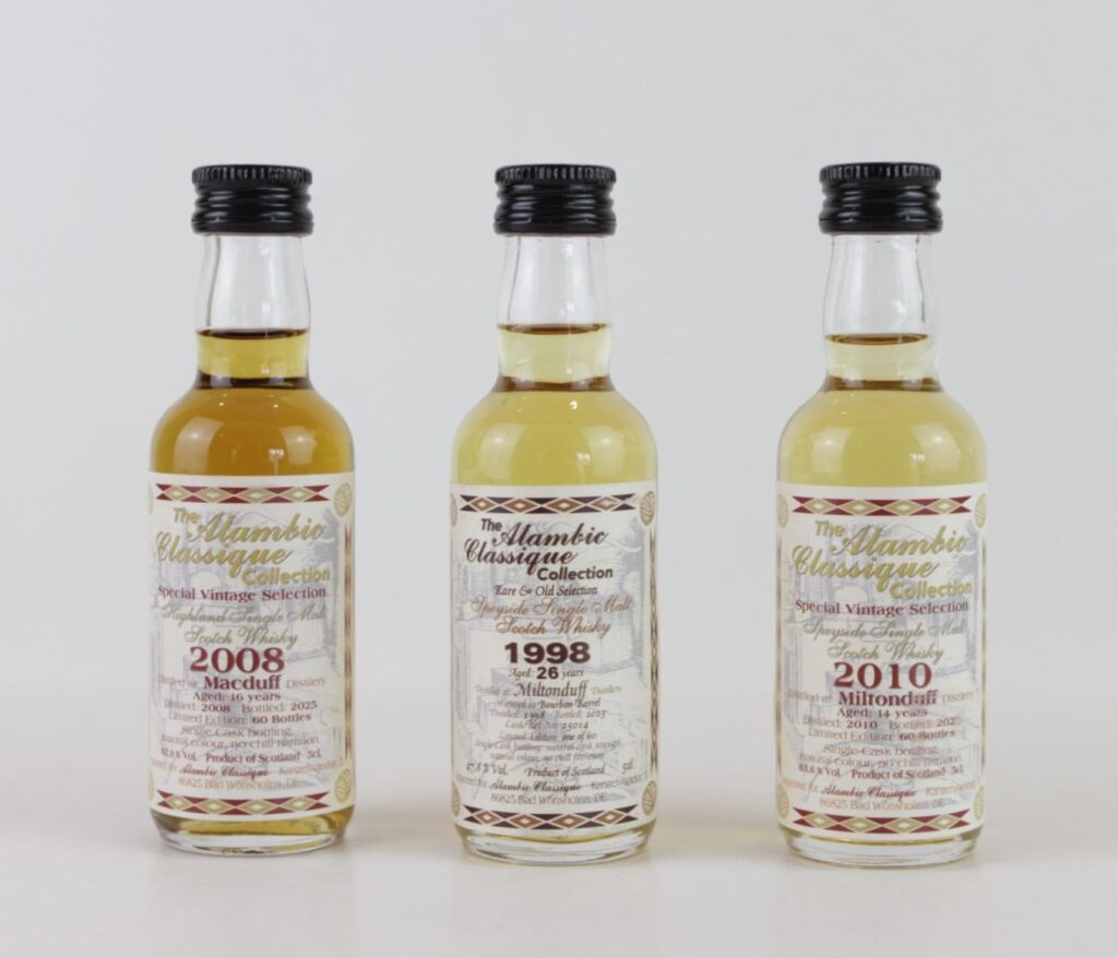 Drei neue interessante Bottlings, ein Miltonduff von 2010 und einer von 1998 sowie ein Macduff von 2008 werden angeboten. Auch erhältlich dazu sind auf jeweils 60 Stück limitierte Miniaturen die der unabhängige Abfüller Alambic Classique neben zahlreichen seiner anderen Abfüllungen zur Messe nach Limburg mitbringt. Die Whiskyfair findet am kommenden Wochenende nach Ostern stattfindet.