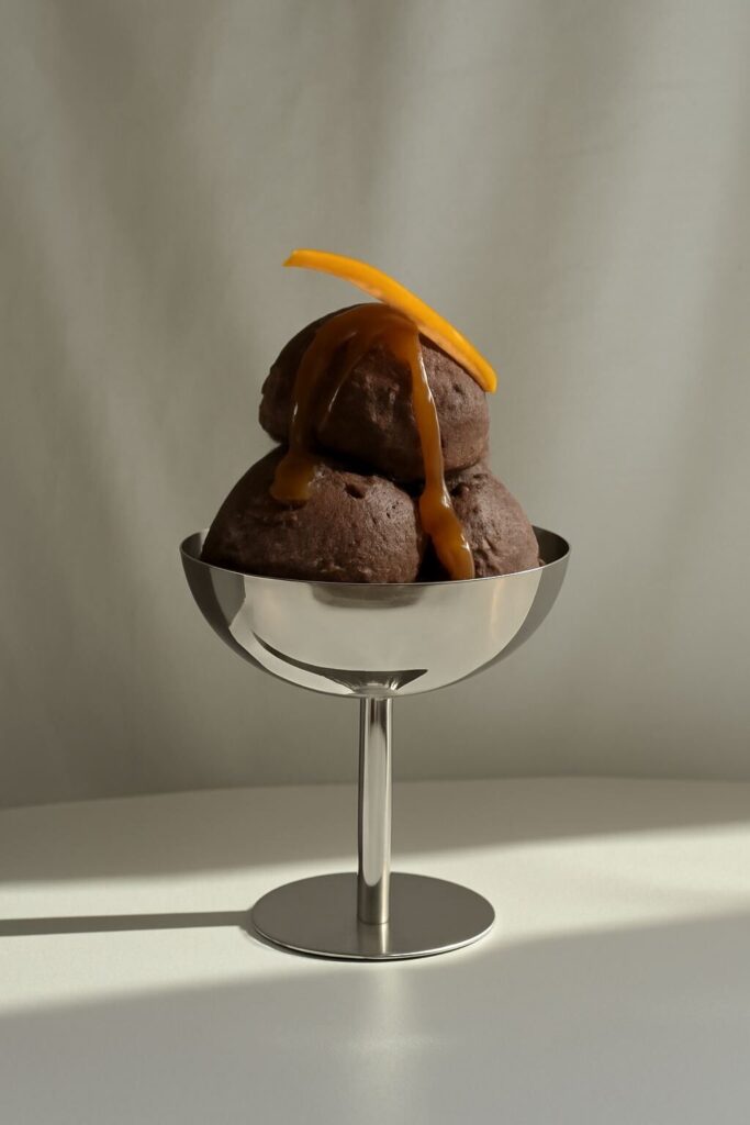 - Schokoladeneis in einem gekühlten Glas oder einer kleinen Dessertschale anrichten.