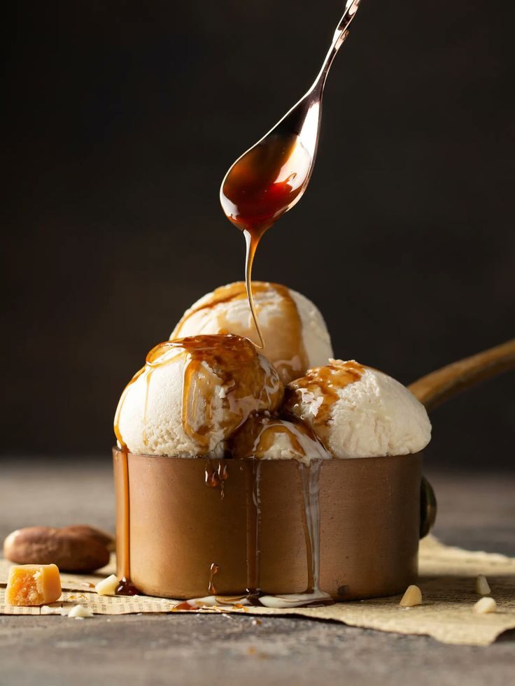 - Eis in eine gekühlte Schüssel geben, warme Bourbon-Karamellsauce darüberträufeln.