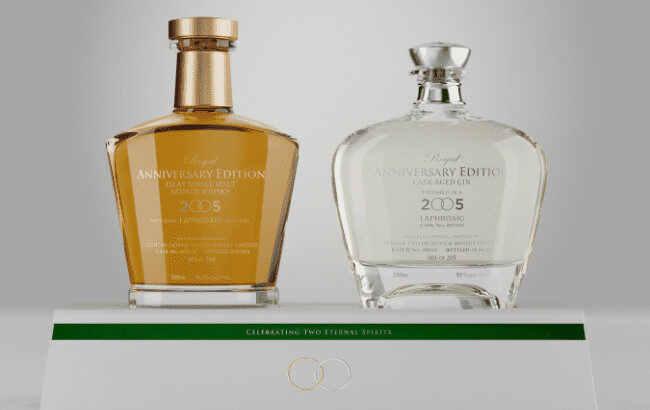 Nun erhalten HM King Charles III und HM Queen Camilla zu ihrem 20. Hochzeitstag ein Set der The Royal Anniversary Edition. Diese besteht aus einem 19 Jahre alten Laphroaig Single Malt, destilliert 2005 und abgefüllt mit 56,4 % Vol.. Zum Set gehört noch ein Gin, der sieben Monate im selben Fass reifte und am Jubiläumstag, dem 9. April 2025, abgefüllt wurde. Der Gin hat einen Vol. von 50 %. Die 700-ml-Whisky- und Gin-Flaschen werden in einer eleganten Vitrine präsentiert, die vollständig aus umweltfreundlichen Materialien gefertigt ist und über einen Sockel zur Präsentation beider Spirituosen sowie ein Echtheitszertifikat verfügt. The Royal Anniversary Edition ist auf 205 Sets limitiert und weltweit bei The Spirits Embassy für £690 (etwa 800 € wären dies) erhältlich.