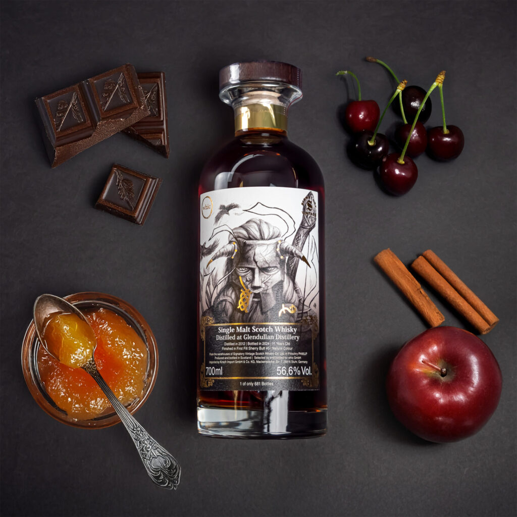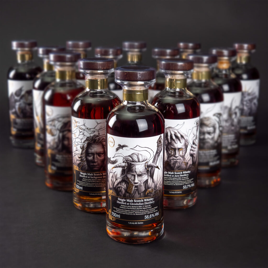 Der Glendullan ist die vierzehnte Abfüllung für whics Edda Serie. Die im Sherryfass gereiften Whiskys der Serie drehen sich rund um die nordischen Götter der Edda Saga. Insgesamt besteht die Reihe aus 15 nicht-rauchigen, dafür sherryschweren Abfüllungen. Die Whiskys kommen in edlen Dekantern mit schweren Korken und passenden schwarzen Tuben. Die detailreichen Bleistiftzeichnungen auf den Etiketten sind mit goldenen Highlights versehen. Ein edles Design für edle Tropfen. Hier haben Sie nicht nur ein echtes Must-Have für Sherryfass-Fans, sondern auch einen tollen Hingucker für Ihre Hausbar.