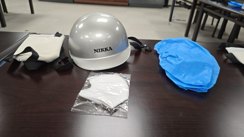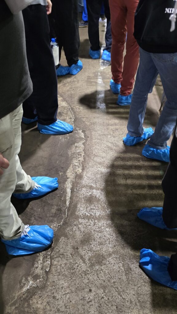 Unser erster Anlaufpunkt war das Verwaltungsgebäude, in dem wir mit der nötigen Schutzausrüstung ausgestattet wurden. Wir erhielten Helme und einen Halter für Wasserflaschen – es war an diesem Tag drückend heiß – sowie Atemschutzmasken, deren Sinn wir recht rasch verstanden, als wir das erste Lagerhaus besuchten. Dazu gab es auch Schuhschoner in Blau.