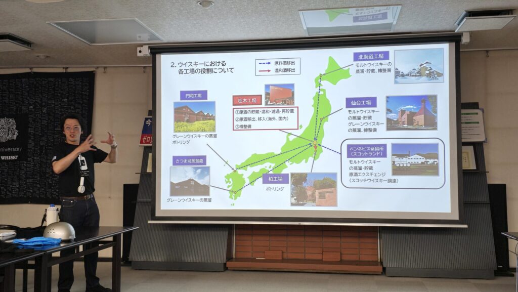 Warum gibt es Tochigi überhaupt? Vieles von dem, was Nikka in Japan verkauft, sind Blends, und die Komponenten dazu werden in verschiedenen Destillerien erzeugt. Das Blending dezentral durchzuführen wäre ein logistischer Albtraum, also bringt man den Whisky zum Reifen und Lagern in eine zentrale Anlage (selbes gilt auch für Nikka From The Barrel, der ebenfalls hier erzeugt wird, einerseits durch Blenden, andererseits durch das Marrying der Fässer – mehr dazu in später und in einem separaten Artikel). Schematisch sieht das so aus: