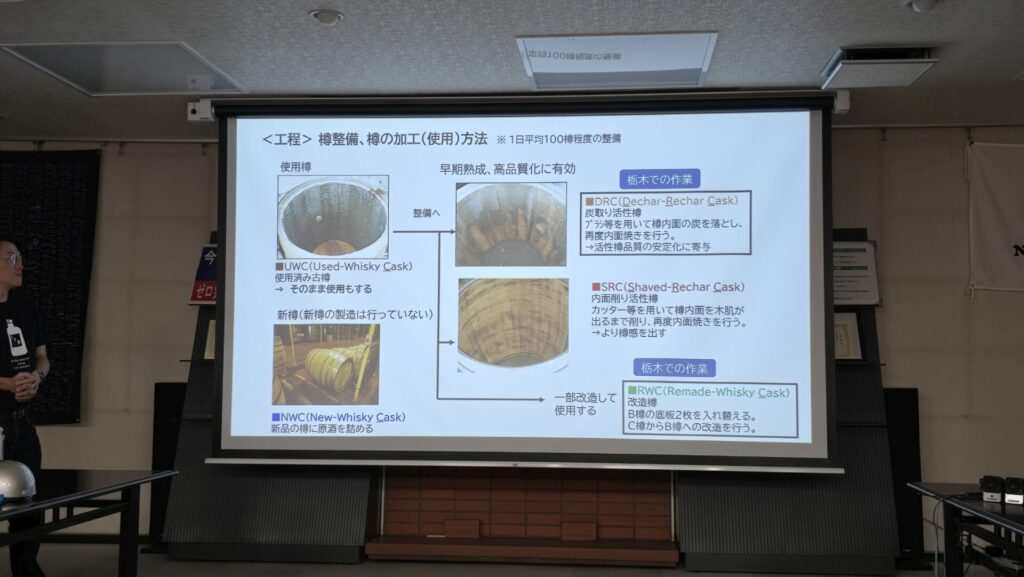 Weiter geht es nun auf die Rückseite des Komplexes, wo jede Menge leere Fässer lagern, zur Aufbearbeitung und zur Wiederbefüllung. Nikka verwendet sowohl gebrauchte als auch neue Fässer, die im internen Jargon als UWC (used whisky cask) und NWC (new whisky cask) bezeichnet werden. Daraus entstehen dann drei Haupttypen von Fässern für die Befüllung: DRC (dechar rechar cask). SRC (shaved rechar cask) und RWC (remade whisky cask), also ein neu zusammengesetztes Fass. Im Schema in der Präsentation sieht das so aus: