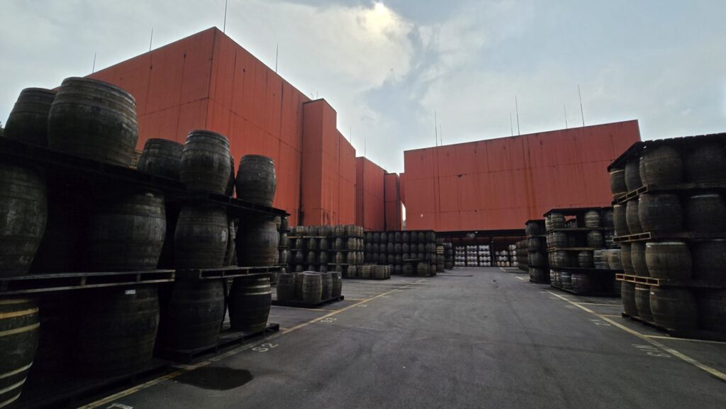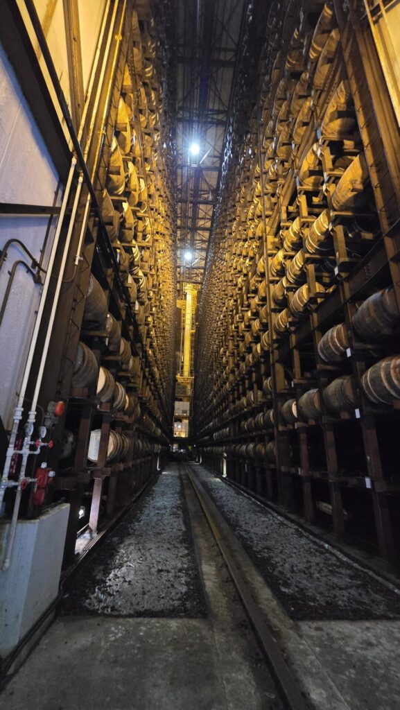 Angekommen, fiel unser Blick sofort auf ein gigantisches Lagerhaus, das das neueste in der ständig wachsenden Anlage ist. 25 Stockwerke hoch werden darin die Fässer gelagert, übrigens alle so wie in jedem Lagerhaus auf Stahlgestellen und liegend – palettierte Lagerung, wie seit einiger Zeit aus Effizienzgründen in vielen schottischen Destillerien angewendet, wird hier nicht praktiziert.