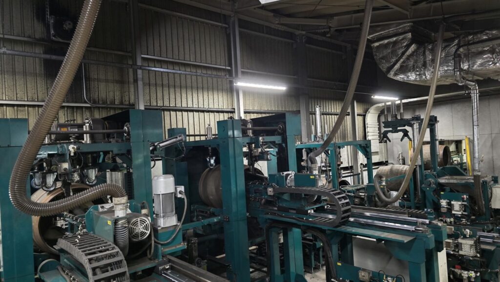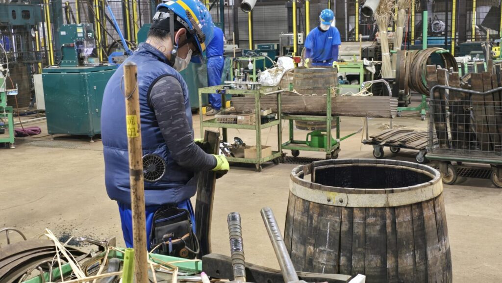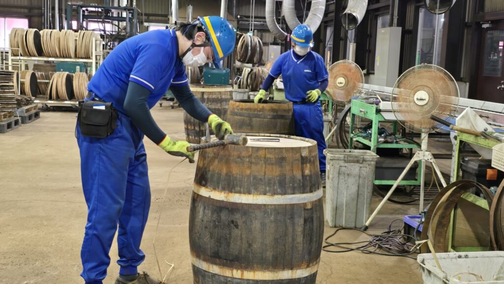 Nächster Punkt auf unserem Rundgang ist die Halle der Böttcherei, in der die Fässer aufbearbeitet werden. Hier findet das decharring und recharring statt, aber es werden auch Fässer repariert und auf Dichtheit geprüft. Auf den nächsten Bildern sehen Sie einige Eindrücke aus dieser großen (und lauten Halle). Die Schläuche, die aus den Rohren an der Decke hängen, sind Zuleitungen von kühler Luft zu den Arbeitsstationen – das Klima vor Ort war bei unserem Besuch tropisch, mit großer Wärme und extremer Luftfeuchtigkeit, und der kurze Regenschauer, der zwischendurch für einige Minuten niederging, war eher eine zu warme Dusche als Erleichterung.