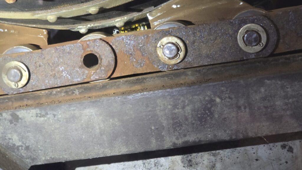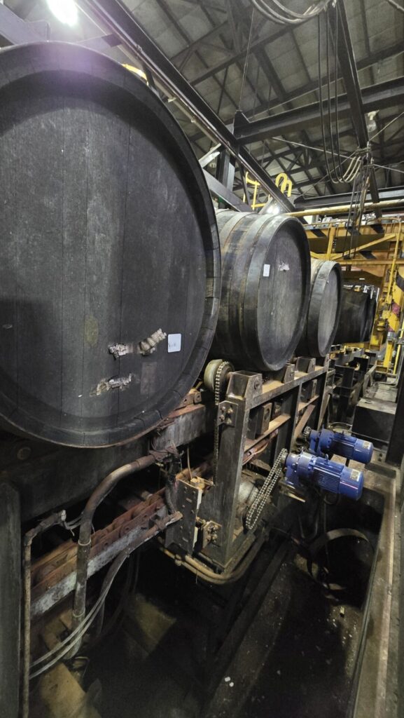 Weiter ging es für uns zur Station, wo die Fässer entleert werden. Auch das ist ein fast vollautomatischer Vorgang. Die einzige händische Tätigkeit dabei ist, das Fassloch, den bunge, zu öffnen. Alles Weitere erledigt eine Maschine, indem sie das Fass so dreht, dass das Loch nach unten zeigt und danach das Fass langsam über die Ausgussrinne am Boden führt, bis es geleert ist. Der Whisky kommt dann in einen Zwischentank. Wie man sich vorstellen kann, ist auch dort das Tragen einer Maske angeraten – auch wenn die Menge des Alkohols in der Atemluft nicht mit der in den Lagerhäusern konkurrieren kann.