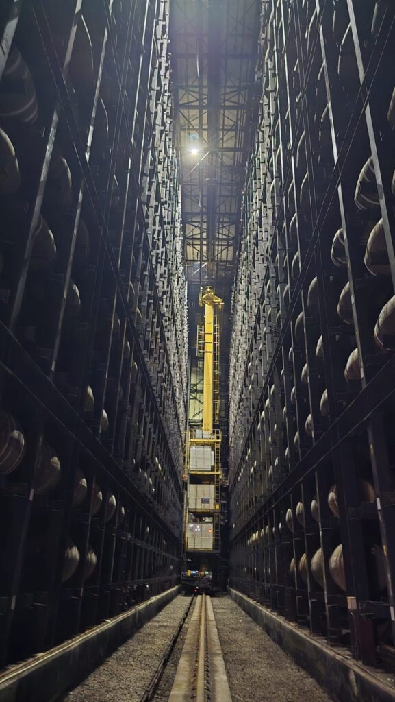 Unser nächster Weg führt uns in das große, würfelförmige Lagerhaus, das noch alle anderen Warehouses deutlich überragt. Es ist relativ neu und noch nicht ganz gefüllt, aber ein Videoblick in die Anlage lässt schon erahnen, wie gigantisch dieser Bau ist. Die Logistik der Fässer darin ist ohne höchster Automatisierung nicht mehr machbar: