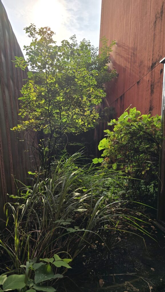 Vor dem zweiten der beiden Lagerhäuser in der südlichen Reihe bleiben wir kurz stehen und lassen unseren Blick mit der Kamera zurück auf den Weg schweifen, auf dem wir gekommen sind, und in den Wald, der diese Lagerhäuser flankiert: