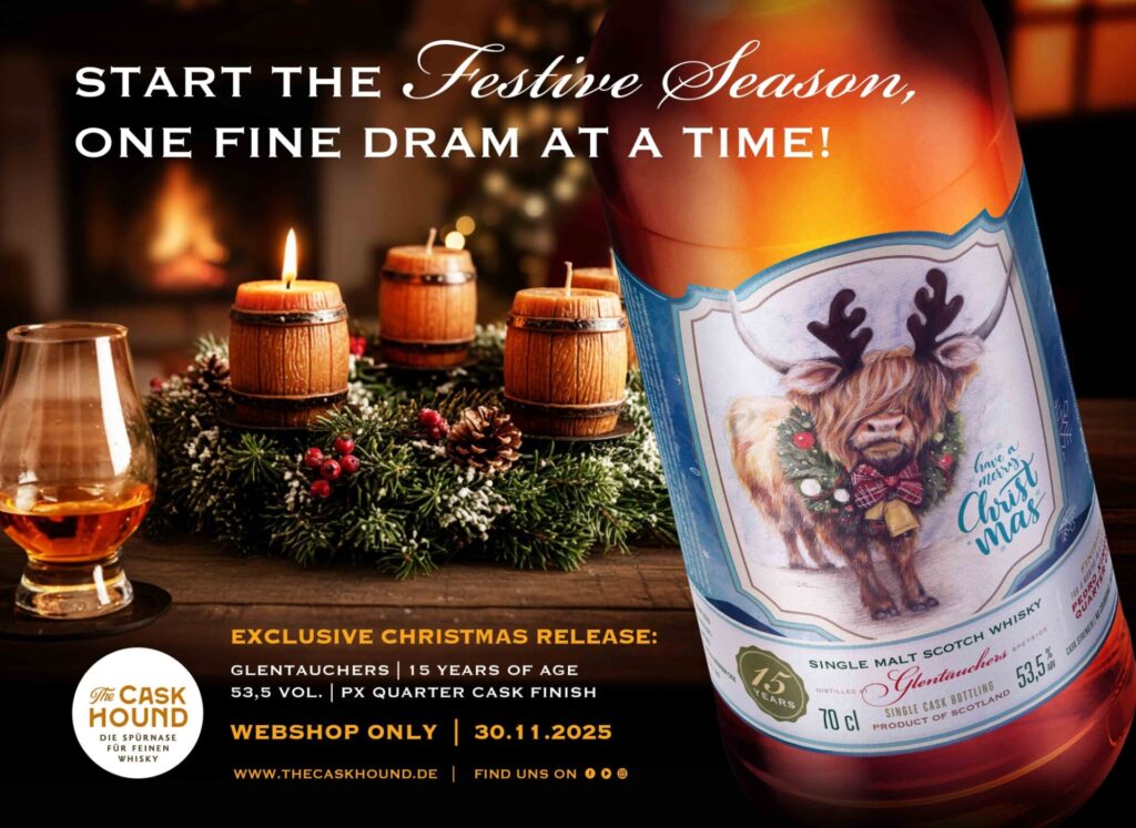 Und noch ein verlockendes Angebot für die Vorweihnachtszeit: Tilo Schnabel aka The Caskhound hat in seinem Fasslager einen 15 Jahre alten Glentauchers mit PX-Finish als sein traditionelles „MERRY CHRISTMAS!“-Bottling abgefüllt – es ist ab sofort und exklusiv im Webshop von The Caskhound verfügbar.