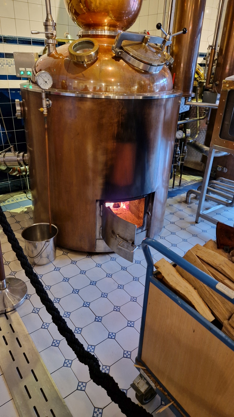 Daraufhin ging es für die Gruppe in den Stillroom. Hier hat die Destillerie zwei Washstills mit einem Volumen von 700 Litern und eine Spiritstill von 800 Litern. Befeuert und angeheizt werden die Brennblasen mit Holz. Auf der gegenüberliegenden Seite des Raumes konnten wir zwei Mitarbeiterinnen dabei über die Schultern schauen, wie die Abfüllungen etikettiert und mit einem Wachsstempel versehen werden, bevor sie im Karton landen. Hierbei erklärte uns Anna Buchholz auch noch, dass nicht nur die Rohstoffe Gerste, Holz und Torf regional bezogen werden, sondern auch die Glasflaschen, Etiketten und Verpackungen. Entsprechend ist das Gesamtprodukt 100% „local“, wie man dazu so schön sagt.