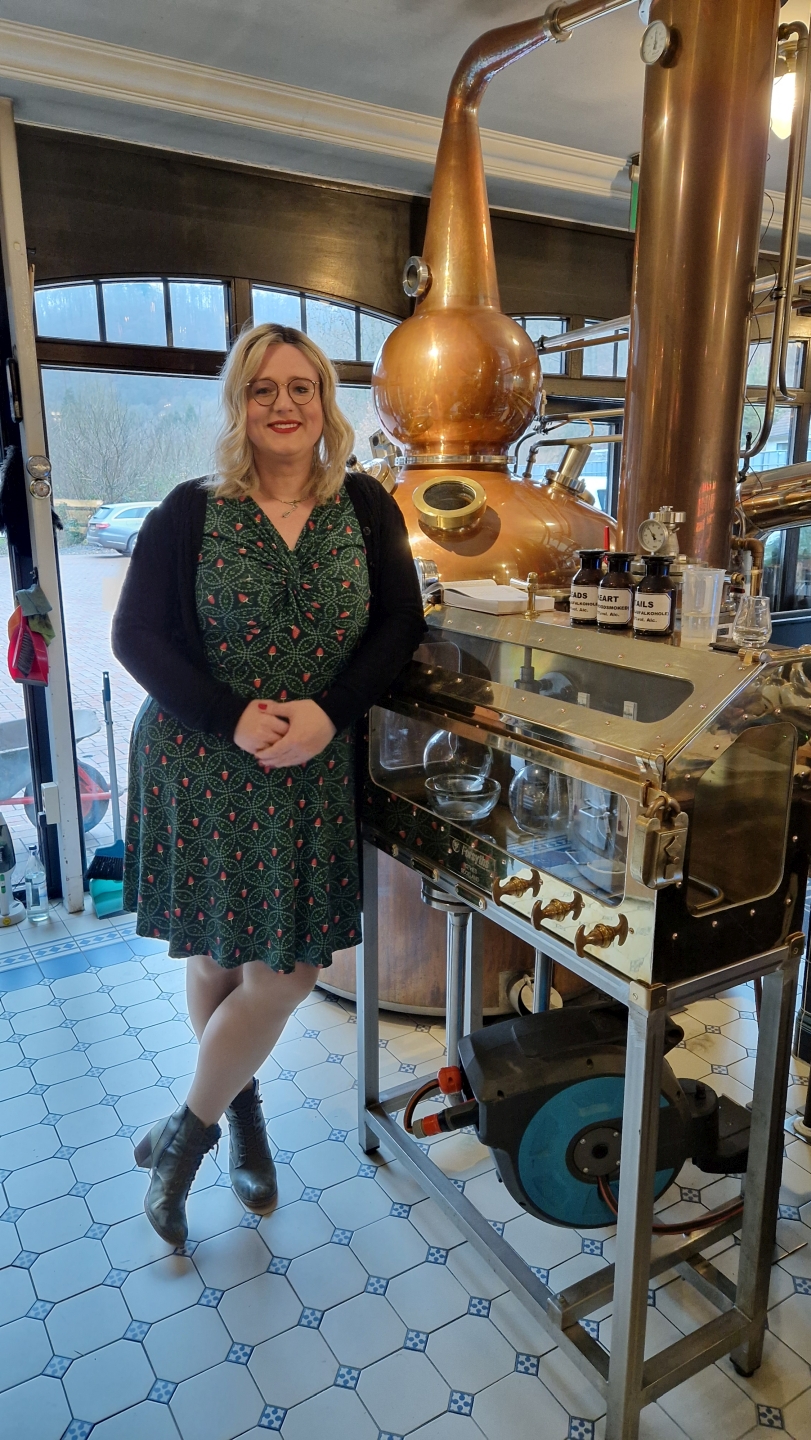 Zu Beginn erzählte Anna Buchholz der Gruppe einiges über die Geschichte der Destillerie und der Region Harz, sowie über die vier Stile, welche die Destillerie brennt. Um den „Elsburn“ herzustellen, wird 100% über Heißluft getrocknete Gerste verwendet. Für den „Willowburn“ kommt zu 50% über Holzrauch getrocknete Gerste ins Spiel, während dieser Anteil für den „Alrik“ bei 100% liegt. Der vierte Stil ist der „Emperors Way“ mit über deutschem Torf geräucherter Gerste. Die Namen der Hausstile haben dabei einen lokalen oder historischen Bezug zum Harz. So bezieht sich „Elsburn“ zum Beispiel auf den Elsbach, welcher direkt am Gebäude der Destillerie vorbeifließt.