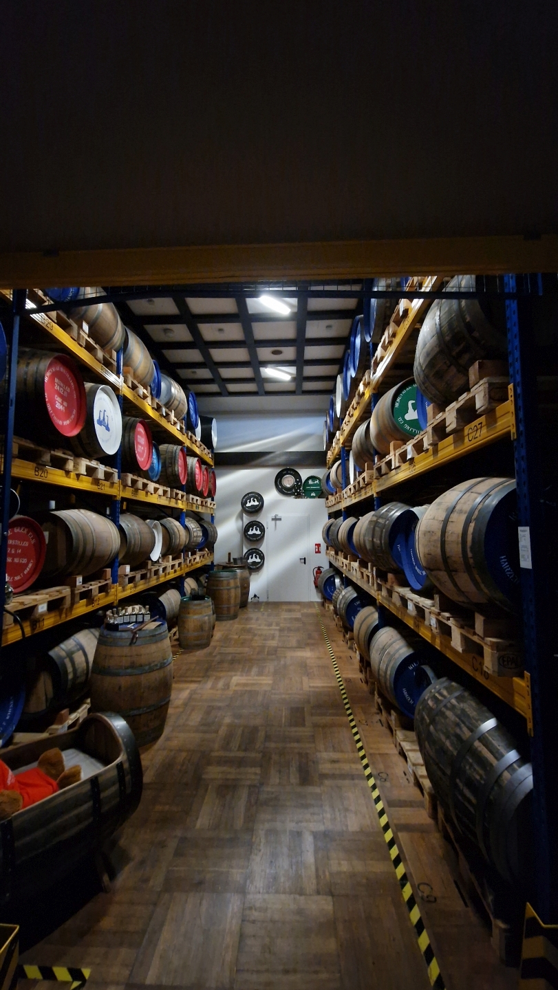 Auf dem Weg zum Fasslager durften wir uns noch einen Dram vom „Elsburn – The Harz“ mitnehmen. Angekommen im Lagerhaus fiel mir doch ziemlich schnell auf, dass der Angels Share, wie man ihn aus schottischen Warehouses kennt, gar nicht so sehr in der Luft zu riechen war. Das liegt, wie Anna Buchholz erklärte, daran, dass für deutsche Lager andere Sicherheitsvorschriften gelten und die Alkoholkonzentration einen bestimmten Wert nicht überschreiten darf. Deshalb gibt es eine aktive Belüftung. Dies hat allerdings auch den Vorteil, dass der Austausch der Fässer mit der Umluft aktiver ist und eine schnellere Reifung bedeutet. Besonders macht die Destillerie zudem ihr Fassmanagement. Nur 4% der Fässer sind American-Oak. Der Rest setzt sich zu 1% aus Mizunara-Weißeiche, als Virgin-Oak und 95% europäischen Eichenfässern zusammen, wobei etwa zwei Drittel davon Sherry-Fässer sind.