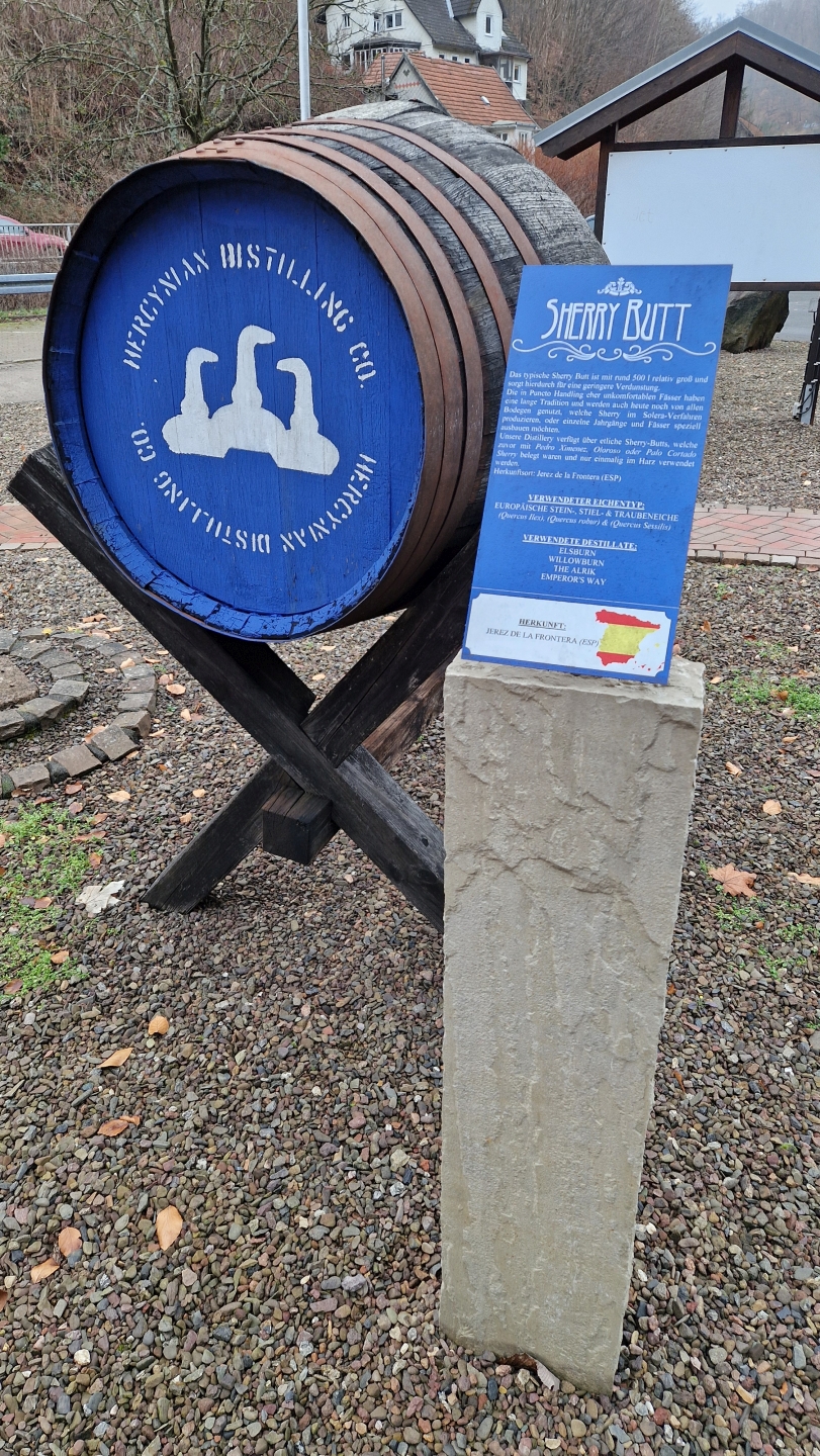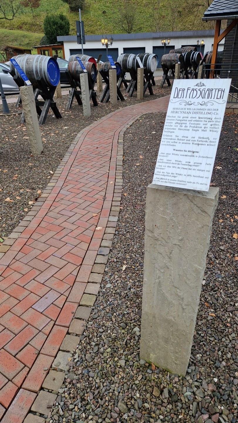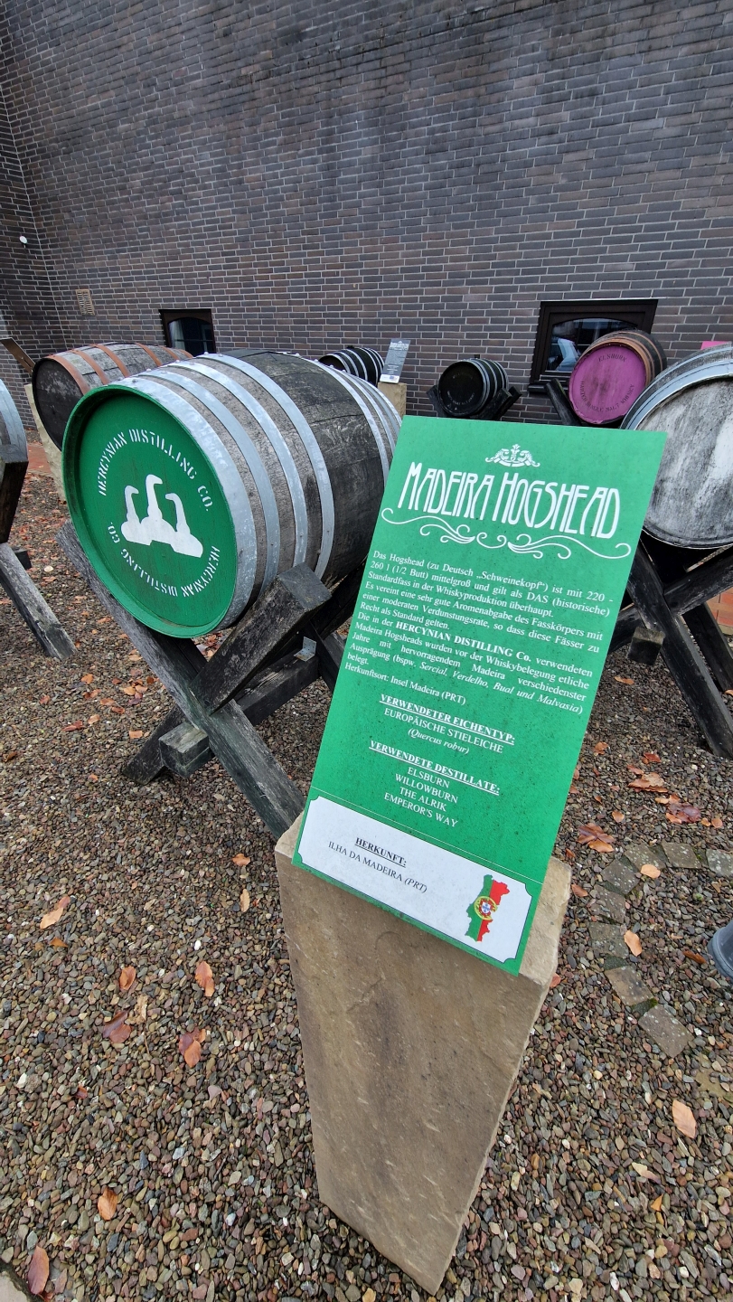 Begrüßt wurde ich direkt neben dem Parkplatz vom sogenannten Fassgarten. Hier präsentiert die Destillerie die diversen Fässer für ihre Reifungen und informiert mit Hinweisschildern über die Herkunft, Vorbelegung und Größe. Die bunten Deckel der Fässer haben dabei mit dem unternehmensinternen Farbcode zu tun.