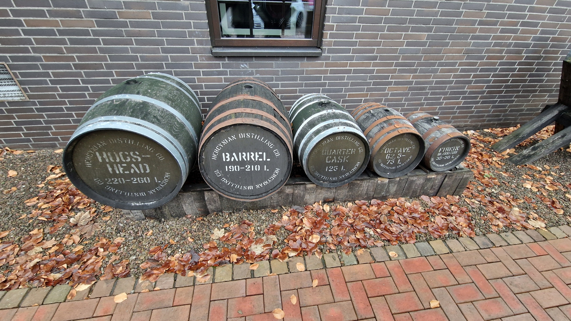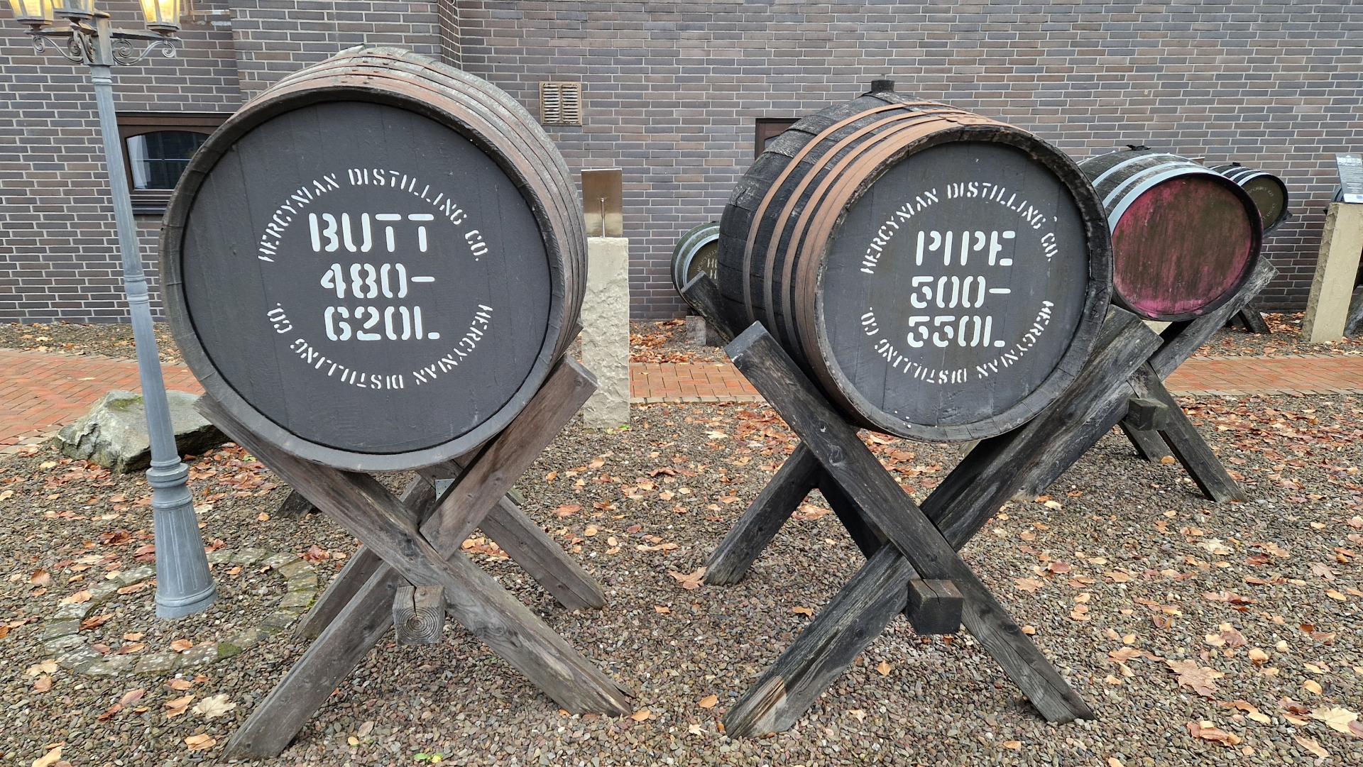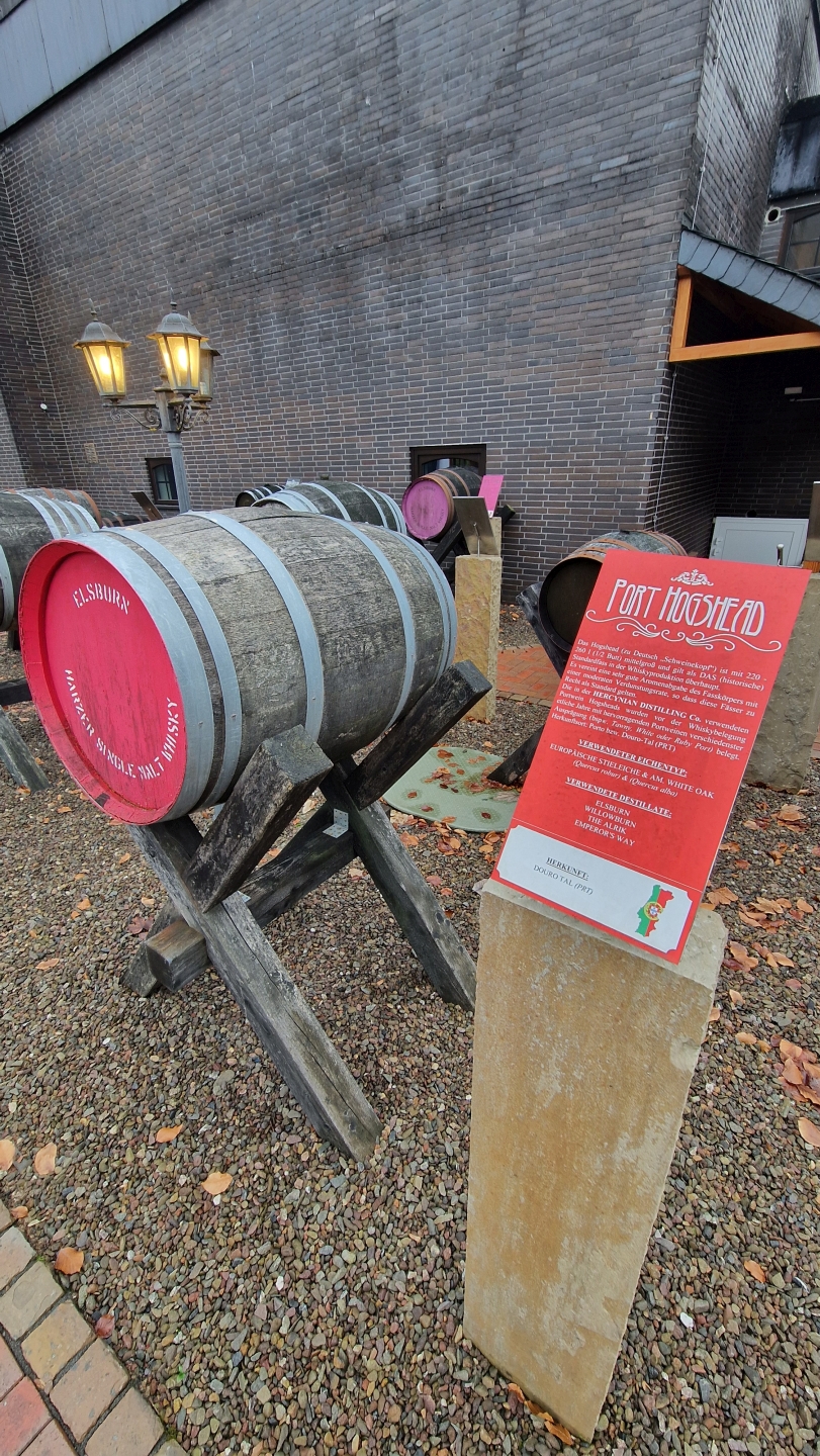 Begrüßt wurde ich direkt neben dem Parkplatz vom sogenannten Fassgarten. Hier präsentiert die Destillerie die diversen Fässer für ihre Reifungen und informiert mit Hinweisschildern über die Herkunft, Vorbelegung und Größe. Die bunten Deckel der Fässer haben dabei mit dem unternehmensinternen Farbcode zu tun.