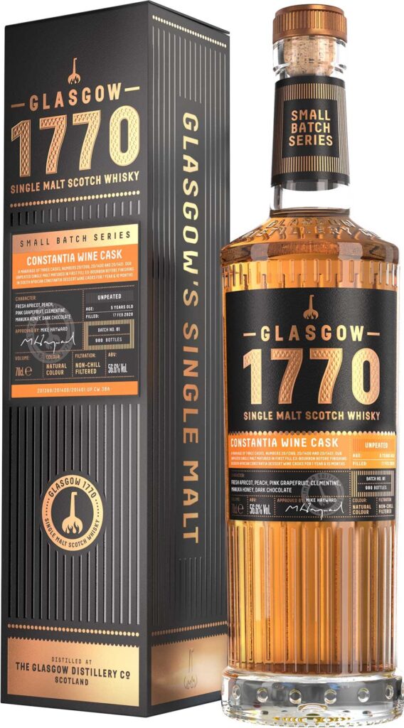 Glasgow 1770 Constantia Wine Cask Matured ist ein ungetorfter Single Malt, der in südafrikanischen Constantia-Dessertweinfässern reifte. Diese Reifung verleiht dem Whisky Noten von frischer Aprikose, Pfirsich, rosa Grapefruit, Clementine, vollem Manuka-Honig und dunkler Schokolade und unterstreicht so den natürlichen, fruchtigen Charakter des Whiskys. Mit 56,6 % Vol. abgefüllt, sind 980 Flaschen erhältlich.