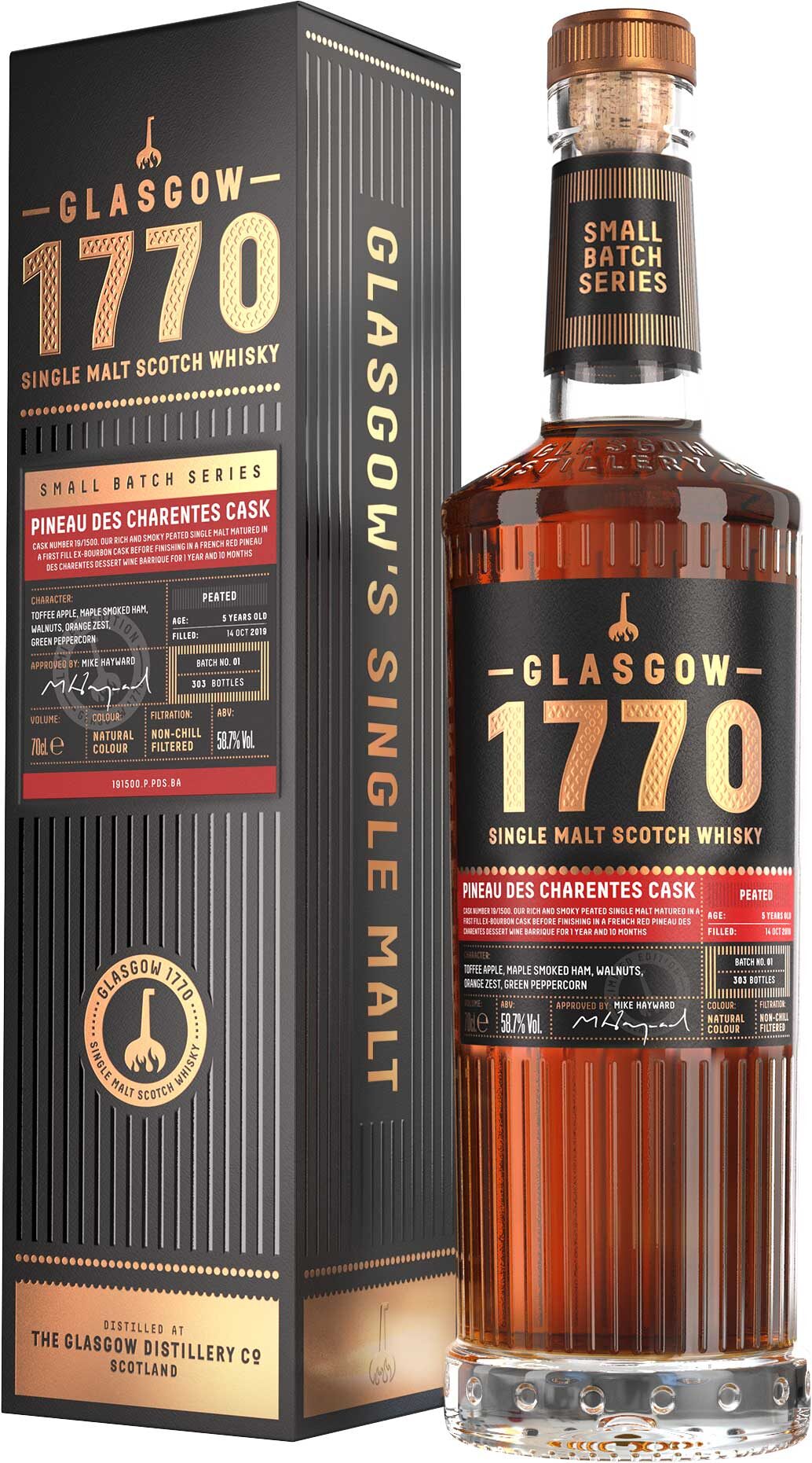 Der einzige getorfte Whisky der Serie, Glasgow 1770 Pineau des Charentes Wine Cask Matured, wurde nach der ersten Reifung in First-Fill-Ex-Bourbon-Fässern in ein französisches Pineau des Charentes-Weinfass umgefüllt. Dieses Fass liefert Aromen von kandiertem Apfel, Ahornsirup, geräuchertem Schinken, Walnüssen, Orangenschale und blumigem grünem Pfeffer. Dieser kräftige Whisky wird mit 58,7 % Vol. abgefüllt und ist nur auf 303 Flaschen limitiert.