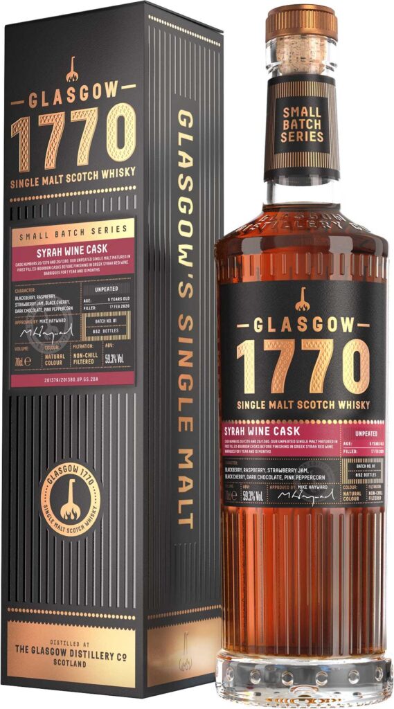 Der zweite ungetorfte Whisky, Glasgow 1770 Syrah Wine Cask Matured, reifte in griechischen Syrah-Rotweinfässern von der Insel Euböa. Der Einfluss des Weinfasses bringt tiefe Noten von Brombeere, Himbeere, Erdbeermarmelade, Schwarzkirsche, dunkler Schokolade und rosa Pfeffer hervor und ergänzt die vollen Vanille- und Karamellnoten des Whiskys. Mit 59,3 % vol. abgefüllt, ist dieser Whisky auf 652 Flaschen limitiert.