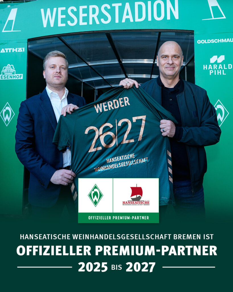 Ab der Saison 2025/26 engagiert sich das Bremer Familienunternehmen mit 50-jähriger Firmenhistorie für die kommenden zwei Jahre als Premium-Partner des SV Werder Bremen. Mit der Werder Partnerschaft wird die Hanseatische Weinhandelsgesellschaft ab dieser Saison als Bandenpartner der Grün-Weißen zwei Jahre die Bande bespielen und blickt mit Vorfreude auf die nationale Präsenz im Stadion, TV sowie Online.