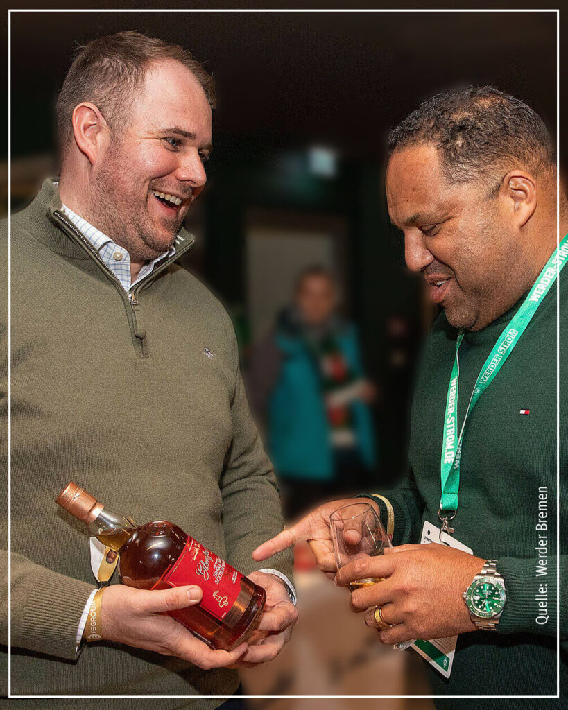 Im vergangenen Jahr bot sich im Rahmen verschiedener Veranstaltungen die Gelegenheit, das HAWE Exklusiv-Marken-Portfolio dem Werder-Publikum vorzustellen. Ein besonderes Highlight fand im Weserstadion in Bremen statt: Dort wurde die Glenfarclas Trinity Series No. 1 – The Sherry Casks Vintage 2012 präsentiert. Für zusätzliche Aufmerksamkeit sorgte die Teilnahme von Werder-Bremen-Ikone Aílton, der gemeinsam mit Duncan Grant, Head of Sales bei Glenfarclas an der Verkostung teilnahm. Die Präsentation der Glenfarclas Trinity Series im Weserstadion erwies sich als gelungene Verbindung aus Genuss und emotionalem Erlebnis.