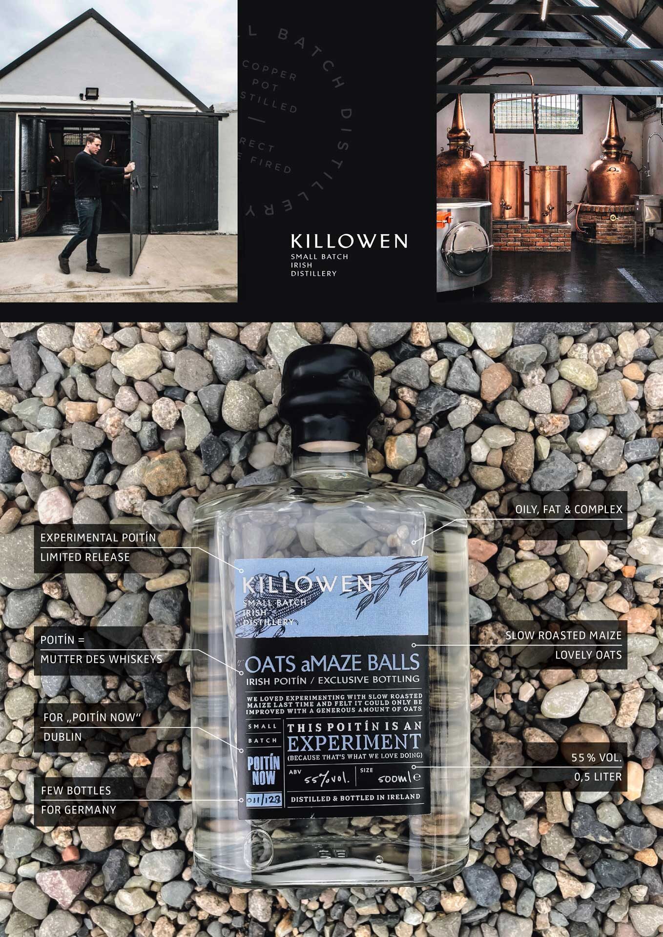 Killowen schafft es auch dieses Jahr wieder, Fans und solche, die es noch werden wollen, mit seiner neuen experimentellen Version zu überraschen. Gleich zum Start konnte Killowen mit Oats aMaze Balls die Goldmedaille bei den Irish Whiskey Awards 2025 in der Kategorie Irisih Poitín gewinnen – ein Beweis für die exzellente Qualität dieser limitierten Abfüllung.