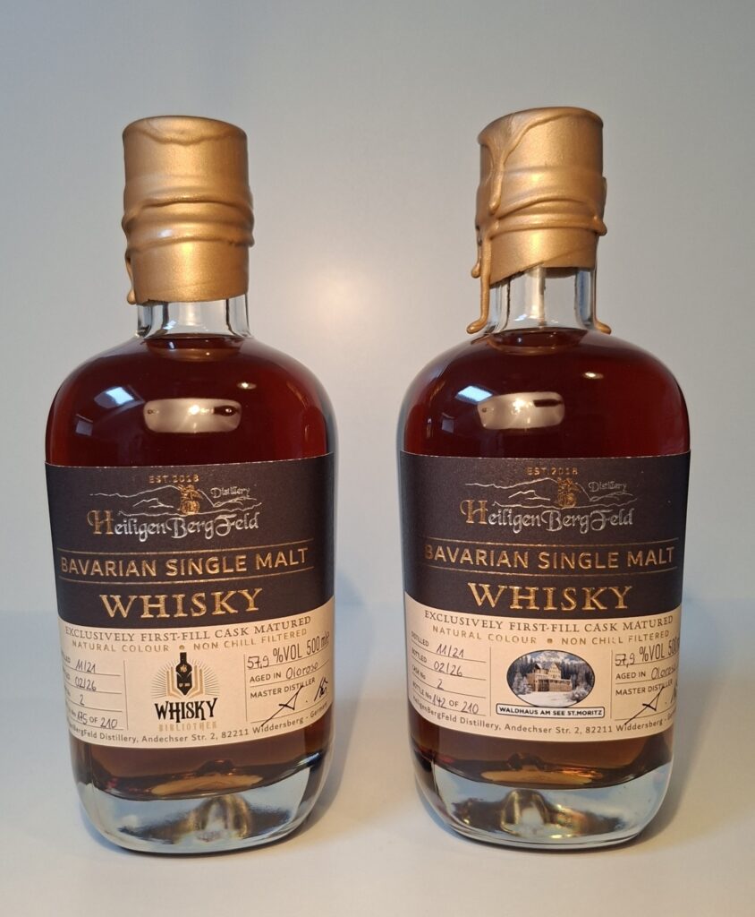 Für die Partner World of Whisky „Waldhaus am See“ – St. Moritz und Whisky Bibliothek – Bern hat die Heiligenbergfeld Distillery ein Oloroso Single Cask abgefüllt und in zwei Chargen zu je 210 Flaschen aufgeteilt – ein Teil davon steht jeweils auch für Whiskyfreunde in Deutschland zur Verfügung. Und zwar bei den Messen in Rüsselsheim und Schwetzingen.