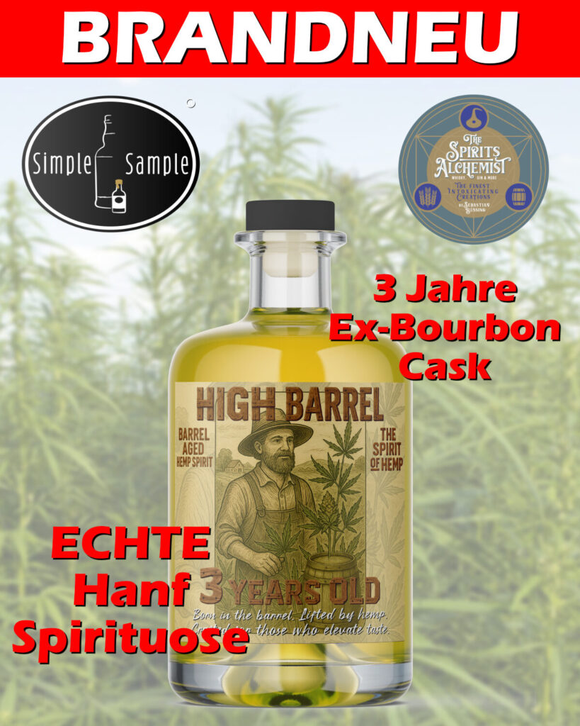 Nein, es ist kein Whisky, aber doch, es geht um Whisky: Der gemeinsam von Simple Sample und The Spirits Alchemist aka Sebastian Büssing auf den Markt gebrachte „High Barrel – The Spirit of Hemp“ ist eine reine Hanf-Spirituose, und zwar die erste ECHTE überhaupt, aber (und jetzt kommen wir zum Whisky): deren Erwerb (0,5l bei = 29,90 €) sichert das Vorkaufsrecht auf einen Single Malt Whisky, der danach in diesem Fass gereift wird und damit der erste Single Malt Whisky mit Hanffass-Reifung sein wird.