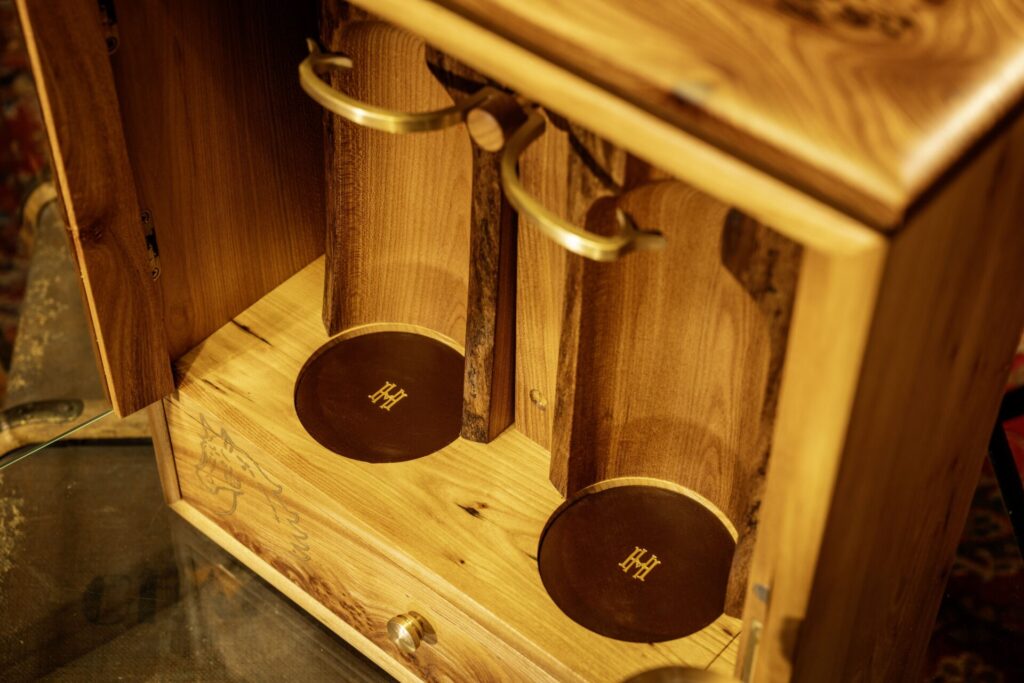 Each set is presented in a bespoke elm wood cabinet, handcrafted from wind-felled trees sourced from the gardens of Hazelwood House by Scottish designer and cabinet-maker Paul Hodgkiss Designs.