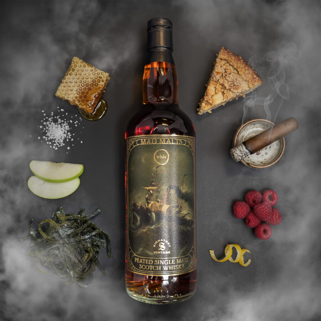 13 stark getorfte Single Malt Scotch Whiskys bilden die whic-exklusive Serie Mad Malts. Die Tropfen werden in Kooperation mit Signatory Vintage ausgewählt und sorgen für rauchigen Genuss. Die Mad Malts flüstern im Glas, sie spielen mit Rauch und Feuer und fordern selbst erfahrene Whiskyliebhaber heraus. Ihre Aromen – mal medizinisch und von Asche geprägt, mal mit Lagerfeuerrauch und maritimen Noten – ziehen den Genießer in die Welt des Torfrauchs. Die Whiskys ruhen in eleganten schwarzen Tuben und jede Flasche zeigt ein klassisches Gemälde – doch etwas ist anders. Monster haben sich eingeschlichen, der Himmel steht in Flammen, die Augen glühen. Kunst, getroffen vom Blitz des Wahnsinns: „Struck by Madness“. Mad Malts – für alle, die verrückt nach rauchigen Whiskys sind.