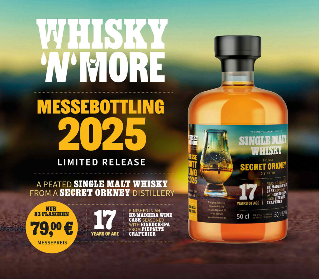 Ein absolutes Highlight der WHISKY ‘N‘ MORE 2025 ist die streng limitierte Messe-Abfüllung, ein exklusiver 17-jähriger SECRET ORKNEY. Die genaue Herkunft des ausdrucksstarken Single Malt Whisky muss zwar geheim bleiben, aber Whiskyfreunde werden schnell erraten, aus welcher bekannten Brennerei auf Orkney-Inseln der Tropfen stammen könnte. Die Abfüllung ist auf lediglich 83 Flaschen begrenzt, nur direkt auf der Messe zu beziehen und verspricht ein wahres Geschmackserlebnis!