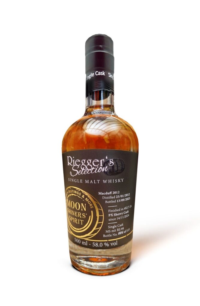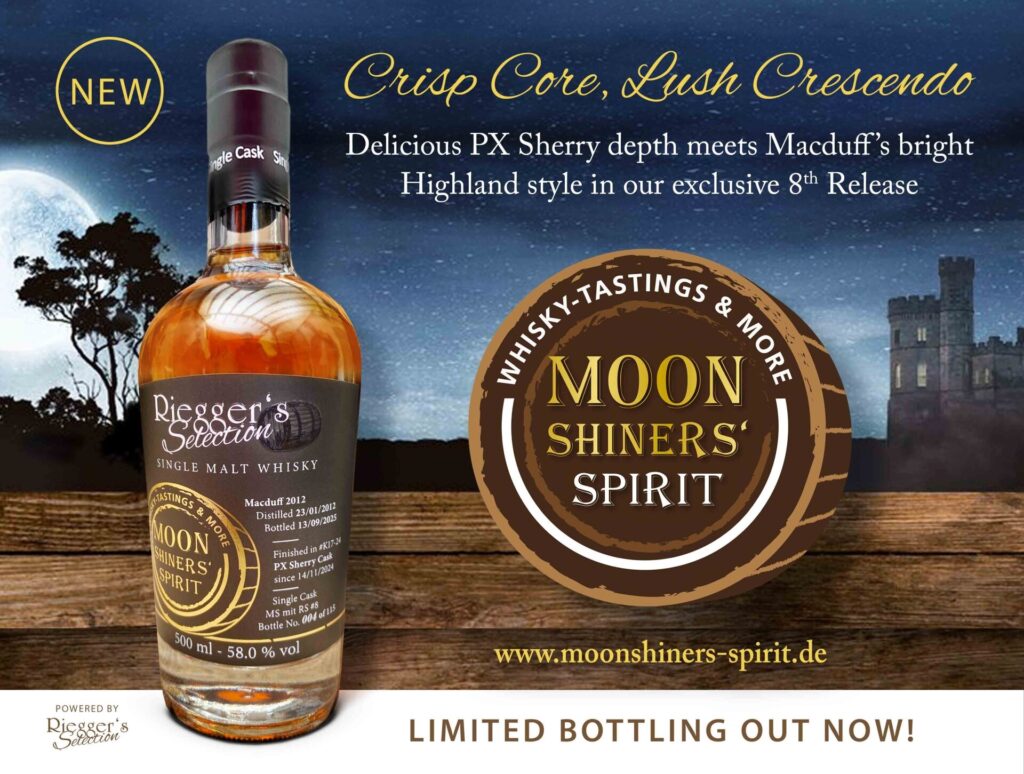 Mit seinem Label MOONSHINERS’ SPIRIT hat sich Whiskyenthusiast Jörg Koeters längst als feste Größe in der deutschen Whiskyszene etabliert. Der Independent Bottler aus Pfinztal bei Karlsruhe veröffentlicht nun die mittlerweile 8. Edition seiner exklusiven Abfüllungsreihe „Moonshiners’ Spirit mit Riegger’s Selection“: ein 13 Jahre alter MACDUFF Single Malt aus den Highlands, veredelt durch ein knapp zehnmonatiges Finish im Pedro Ximénez Sherry Cask und abgefüllt mit kraftvollen 58 % Vol.