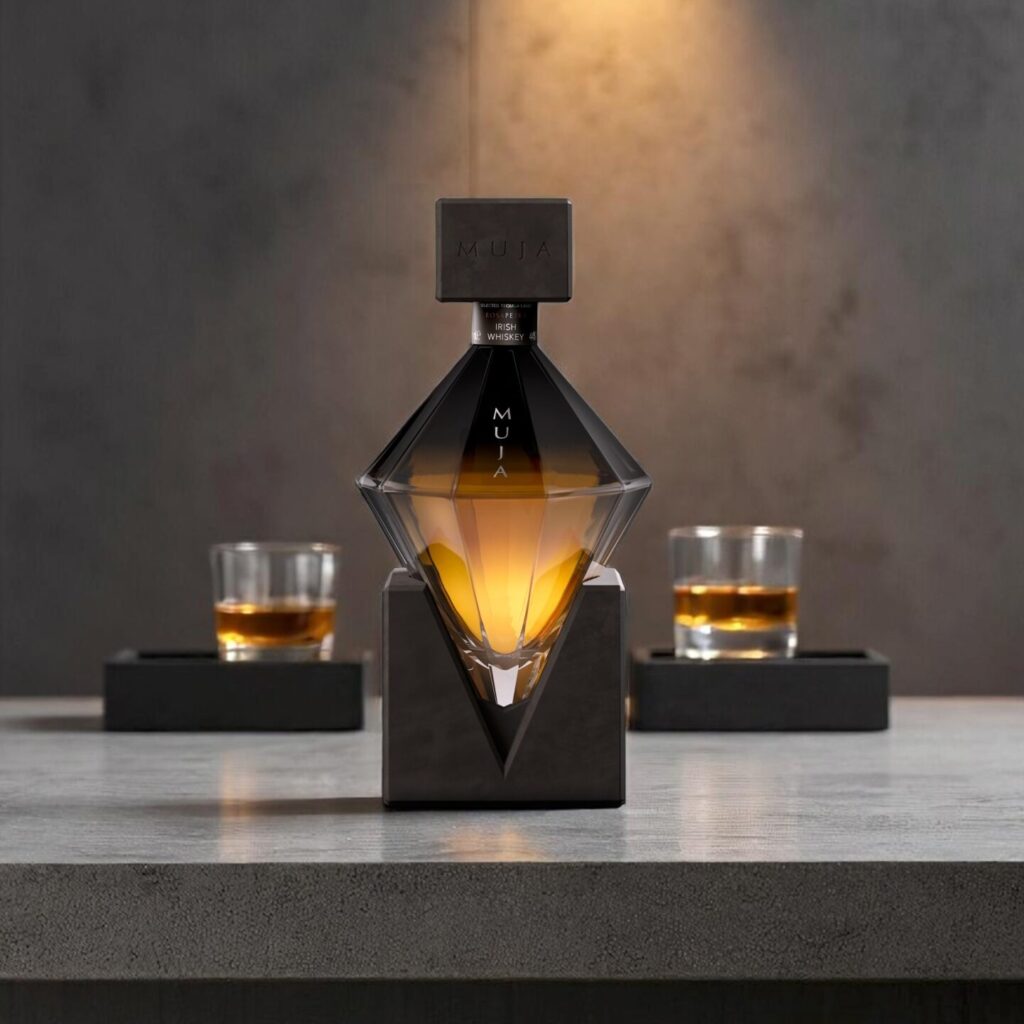 Die rauchschwarze, diamantförmige Flasche mit Sockel und Verschluss aus schwarzem Beton ist nicht nur ein Blickfang, sondern auch eine Hommage an die dramatischen Landschaften Irlands – Klippen und Berge, die im Licht der untergehenden Sonne in goldenen Tönen leuchten, wie der edle Tropfen im Inneren.