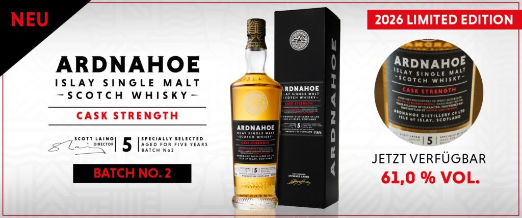 Nach dem großen Erfolg der ersten Cask Strength Edition legt die junge Islay-Destillerie Ardnahoe jetzt mit dem neuen Ardnahoe Cask Strength Edition – Batch No. 2 2026 nach. Der 5 Jahre alte rauchige Single Malt erreicht über den Importeur HaWe Bremen den deutschen Markt – sie finden ihn beim Fachhändler Ihres Vertrauens im Geschäft oder Online zum UVP von 84,90 €.