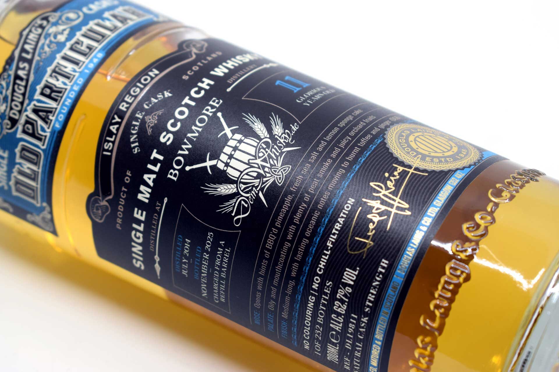 Der Islay Single Malt wurde im Juli 2014 destilliert und reifte elf Jahre lang in einem Refill Barrel, bevor er im November 2025 in natürlicher Fassstärke abgefüllt wurde. Insgesamt entstanden lediglich 232 Flaschen, die exklusiv über deinwhisky.de erhältlich sind. Auf Färbung und Kühlfiltration wurde wie bei Douglas Laing üblich vollständig verzichtet.