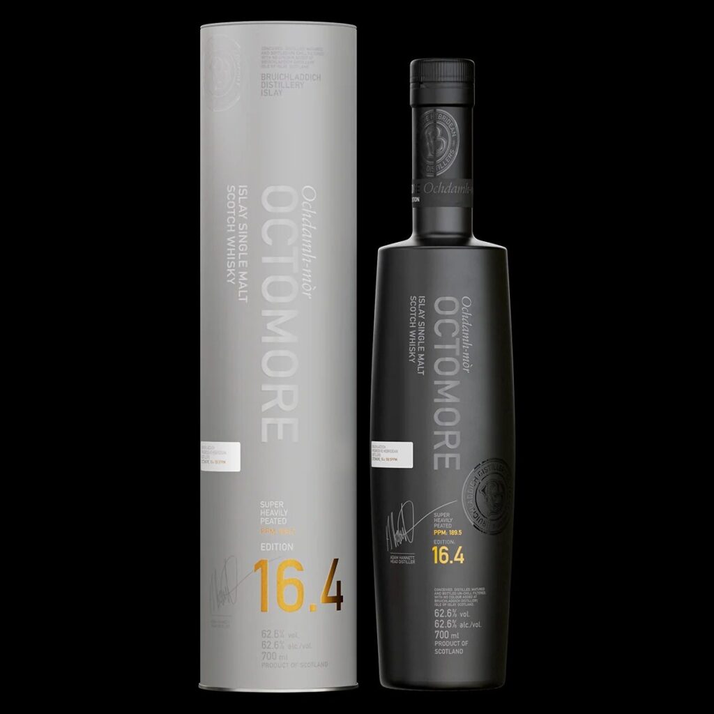 Der Octomore 16.4 wurde 2019 destilliert, mit 100% auf Islay gewachsener Concerto-Gerste der Ernte 2018. Die Gerste wurde stark getorft, der Torfgrad wurde mit 189,5PPM (parts per million) gemessen, wahrscheinlich direkt nach der Trocknung über dem Torfrauch. Gereift ist der Octomore 16.4 in Bourbonfässern und französischen Virgin Oak Fässern, er wurde mit 62,2% vol. Alkoholstärke abgefüllt.