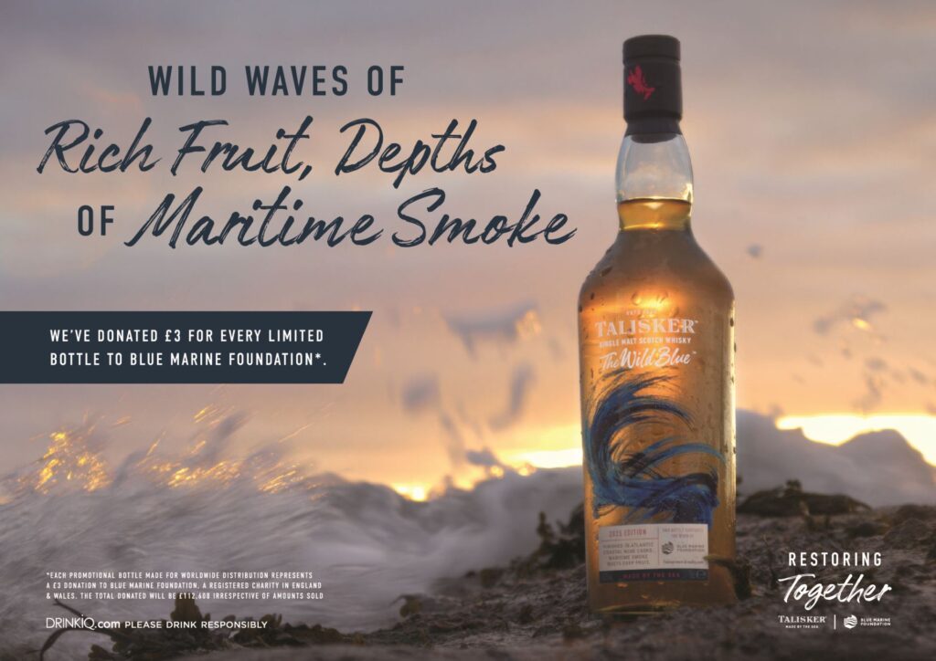 Der neue Talisker: The Wild Blue ist ein limitierter Single Malt Scotch Whisky in einer 100 % recycelten Glasflasche. Für jede produzierte Flasche wurden 3 £ an die Blue Marine Foundation gespendet und kommen Projekten zugute, die zur Wiederherstellung wichtiger Küstenlebensräume beitragen. Die Gesamtsumme der Spende beträgt £112,608.