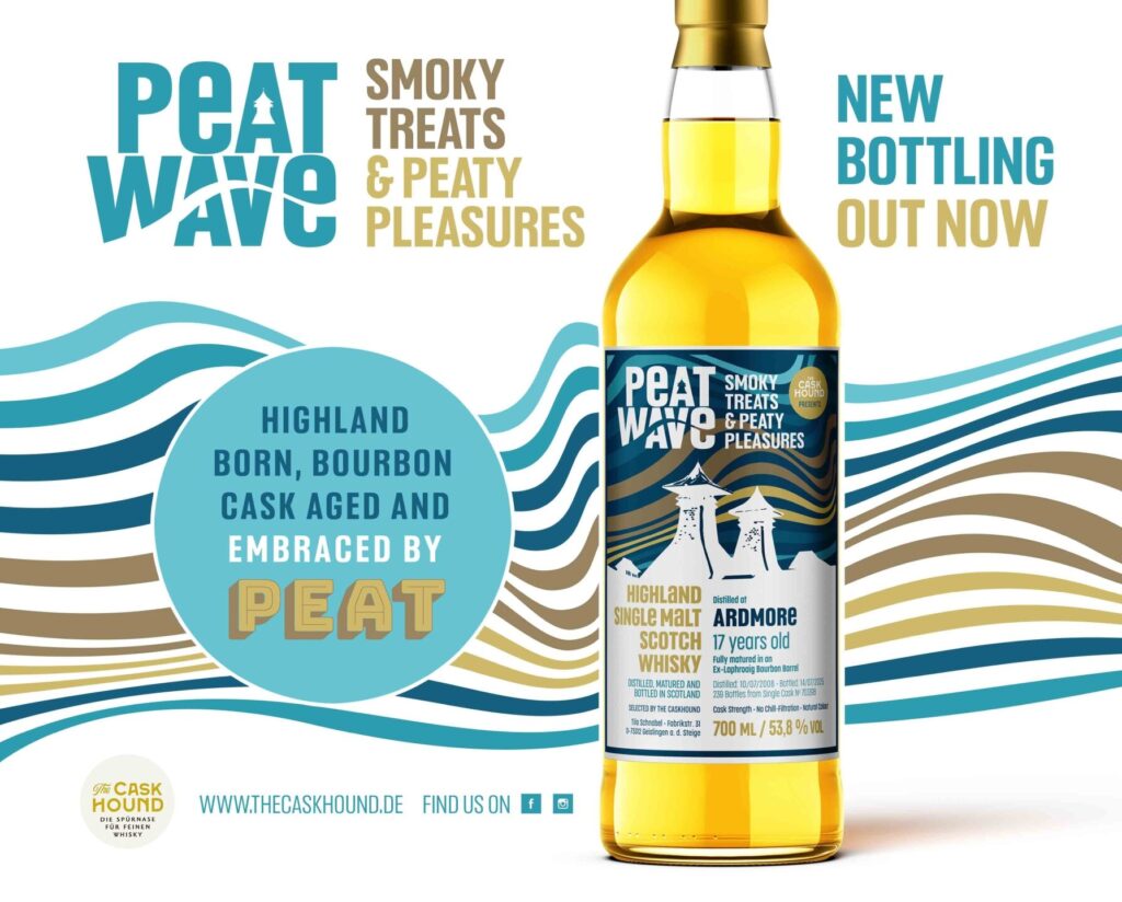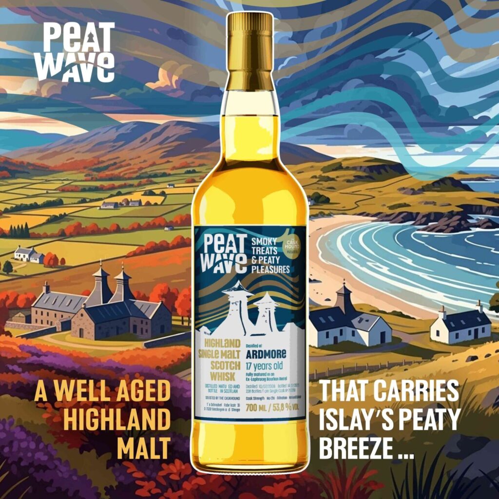 Wenn der Oktober mal wieder grau statt golden daherkommt, hat THE CASKHOUND-Spürnase Tilo Schnabel genau den passenden Dram am Start, um trübe Herbsttage weg zu pusten: ein neuer PEATWAVE, der Nase und Gaumen strahlen lässt! Ganze 17 Jahre durfte unser ARDMORE reifen – in einem Ex-Bourbon Barrel mit speziellem Islay-Kick, das ihm eine spannende Extra-Note verpasst hat. Das Ergebnis: eine traumhafte Verbindung von malziger Süße, Islay Breeze und würzigem Torfrauch – genau die richtige Medizin gegen Herbstblues.