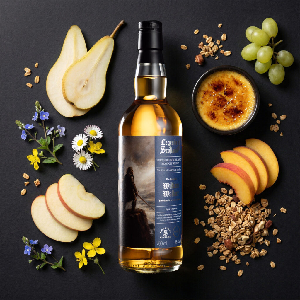Im Glas zeigt sich der Whisky frisch und enthusiastisch, ganz im Geiste des schottischen Freiheitskämpfers. Die Nase wird von köstlich einnehmenden, hellen Fruchtnoten wie Pfirsich, Apfel, Birne und Weintrauben umspielt. Begleitet werden diese von angenehm würzigen Getreidenoten und einem Hauch Rosmarin. Darauf folgen süße, cremige Anklänge von Limetten-Käsekuchen, Griechischem Joghurt mit Honig und Aprikosenmarmelade – wie eine frühlingshafte Brise über die Wiesen der Speyside.